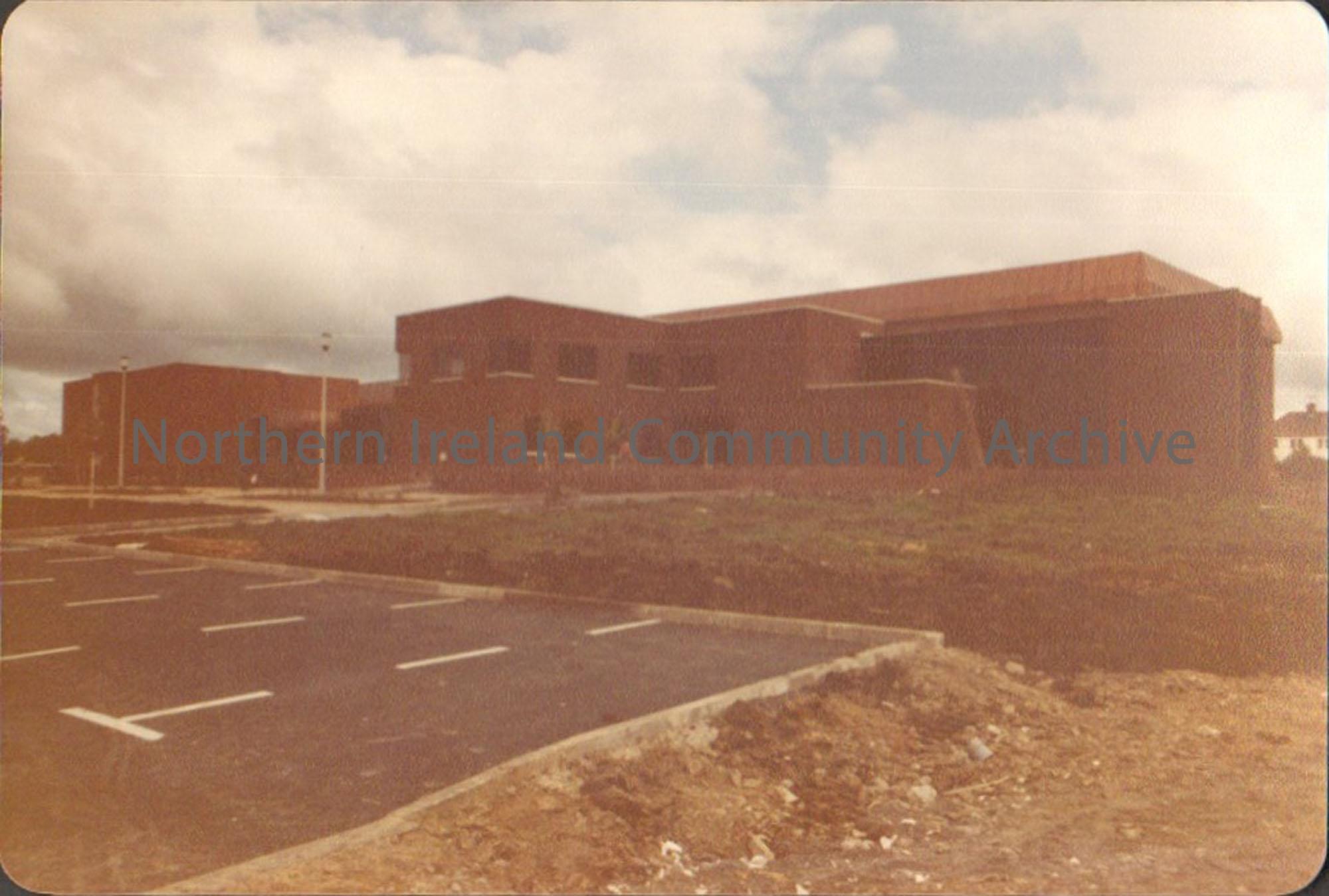 Colour photograph of Riada Recreation Centre. Large brown square building with corner of car park in front of it.