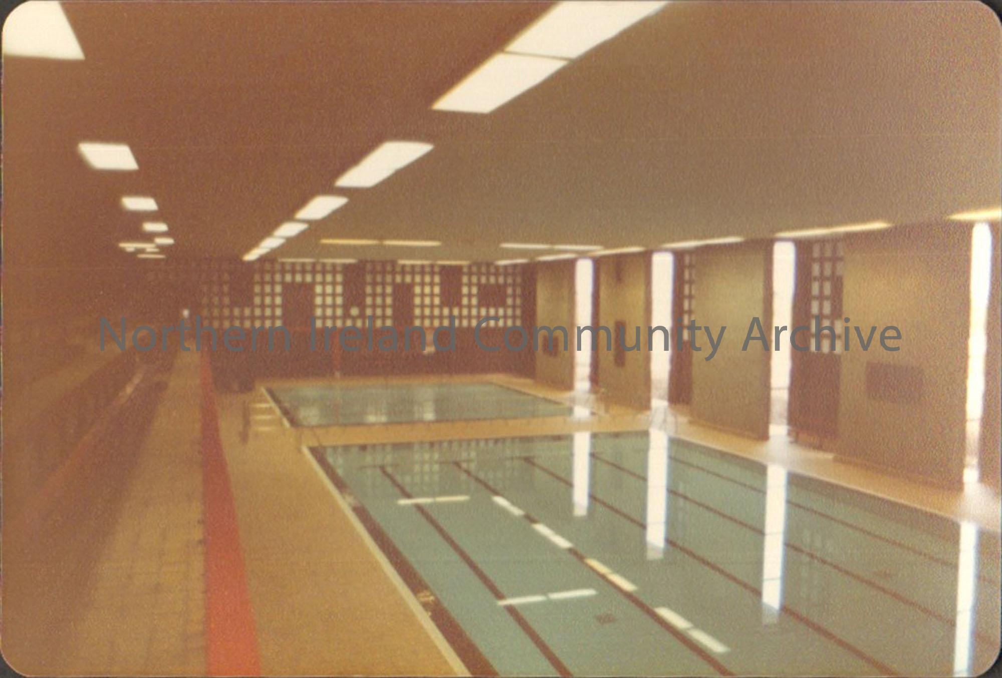 Colour photograph of the swimming pool inside Riada Recreation Centre. Two swimming pools one large and one smaller in the distance. Red balcony rail …