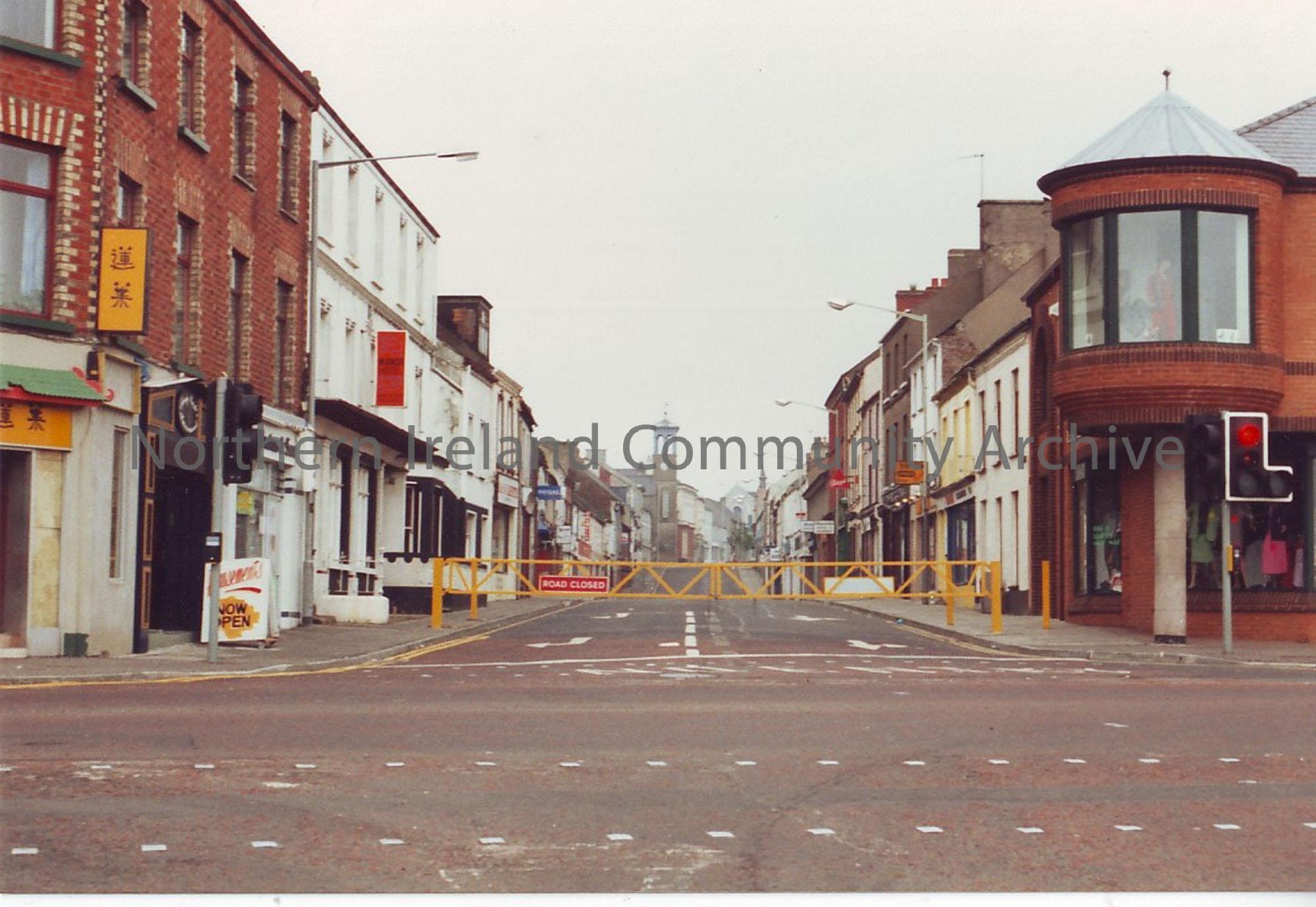 colour photograph. View up Main Street, taken from Seymour Street c 1990s WInsome Lady shop can be seen on right hand side. Yellow security barrier going across the bottom of the street with 'road closed' sign