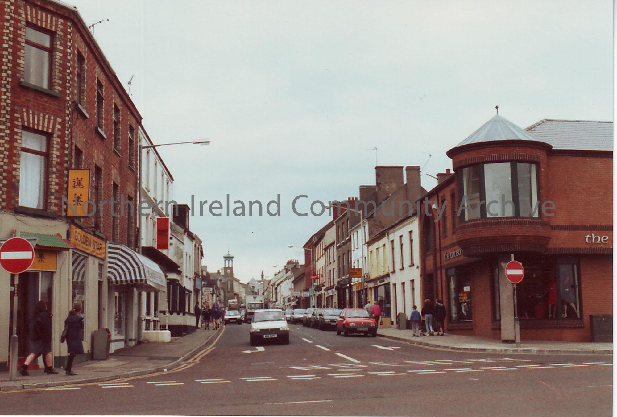 colour photograph. View up Main Street, taken from Seymour Street,c 1990s. WInsome Lady shop can be seen on right hand side.