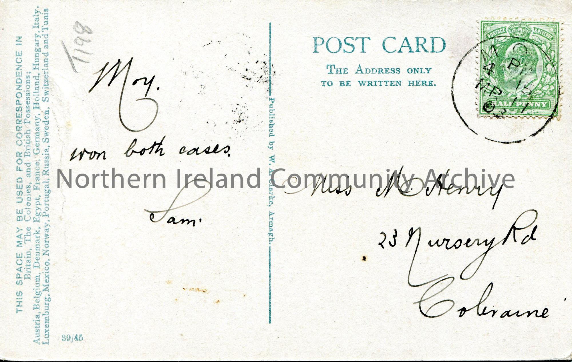 Colour post card featuring an illustration of St. James’ Church, Moy. To Miss M. Henry from Sam Henry. Writes that he ‘won both cases’. – T198b