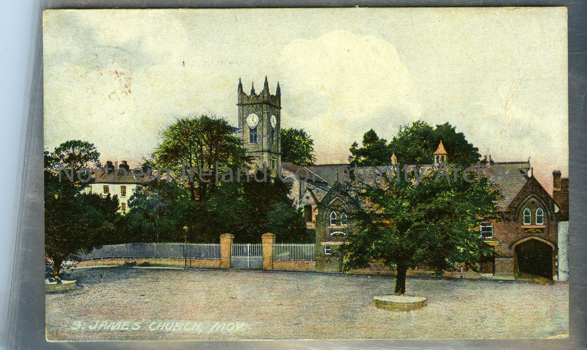 Colour post card featuring an illustration of St. James’ Church, Moy. To Miss M. Henry from Sam Henry. Writes that he ‘won both cases’.