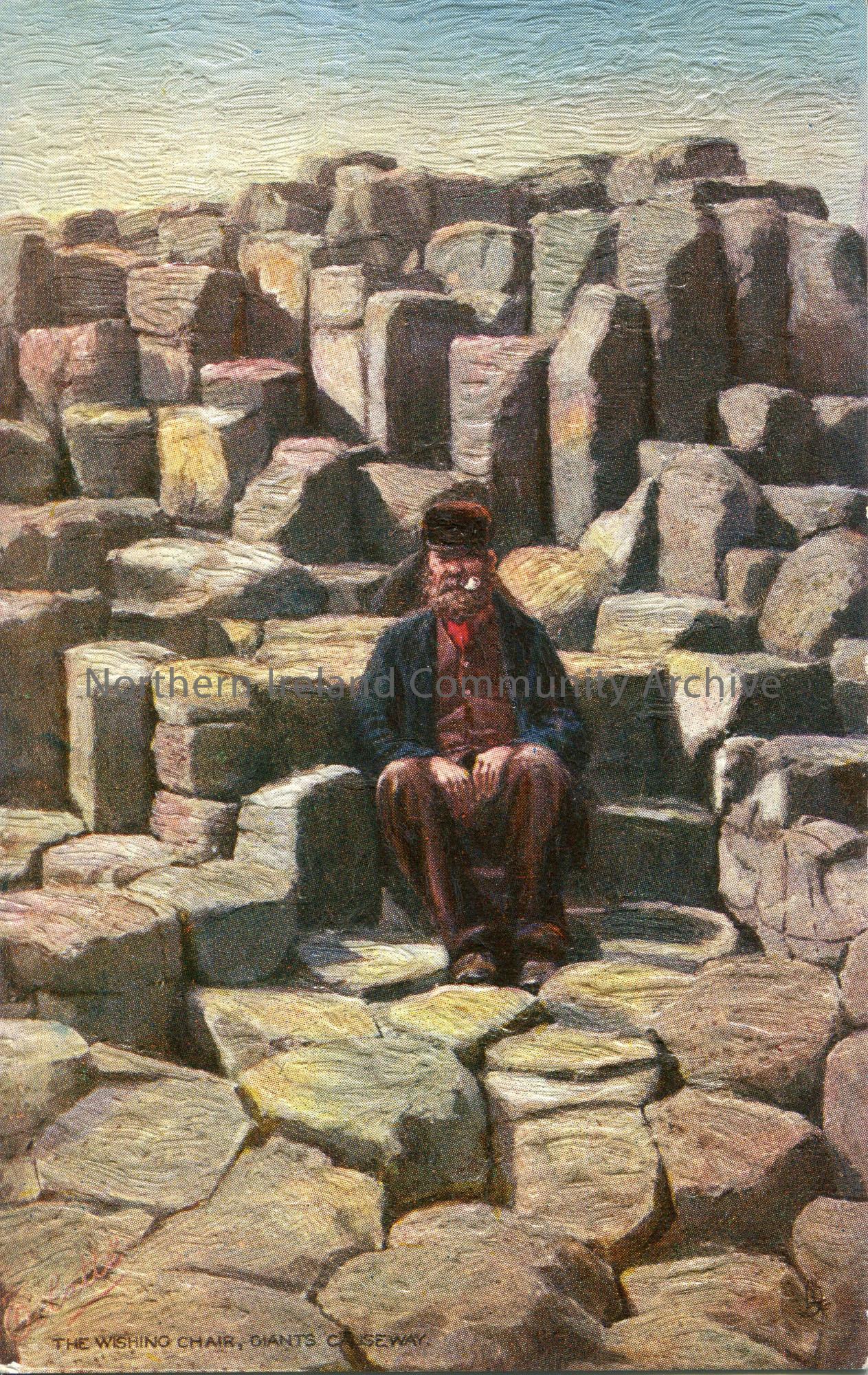 Colour post card titled, ‘The Wishing Chair, Giant’s Causeway’. Featuring a man sitting on the rocks smoking a pipe. The image on the front of the pos…