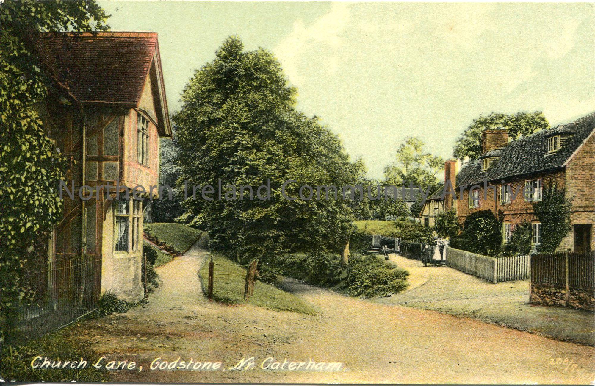 Colour postcard of Church Lane, Godstone, North Caterham featuring a painted village scene of houses and trees. Addressed to Miss M[aimie]. Liken, Dunedin, Coleraine. From Sam Henry in 1913. Green, half penny King Edward VII postage stamp pasted top right corner. Sam writes, 'Delightful old world village. Am becoming quite English'.