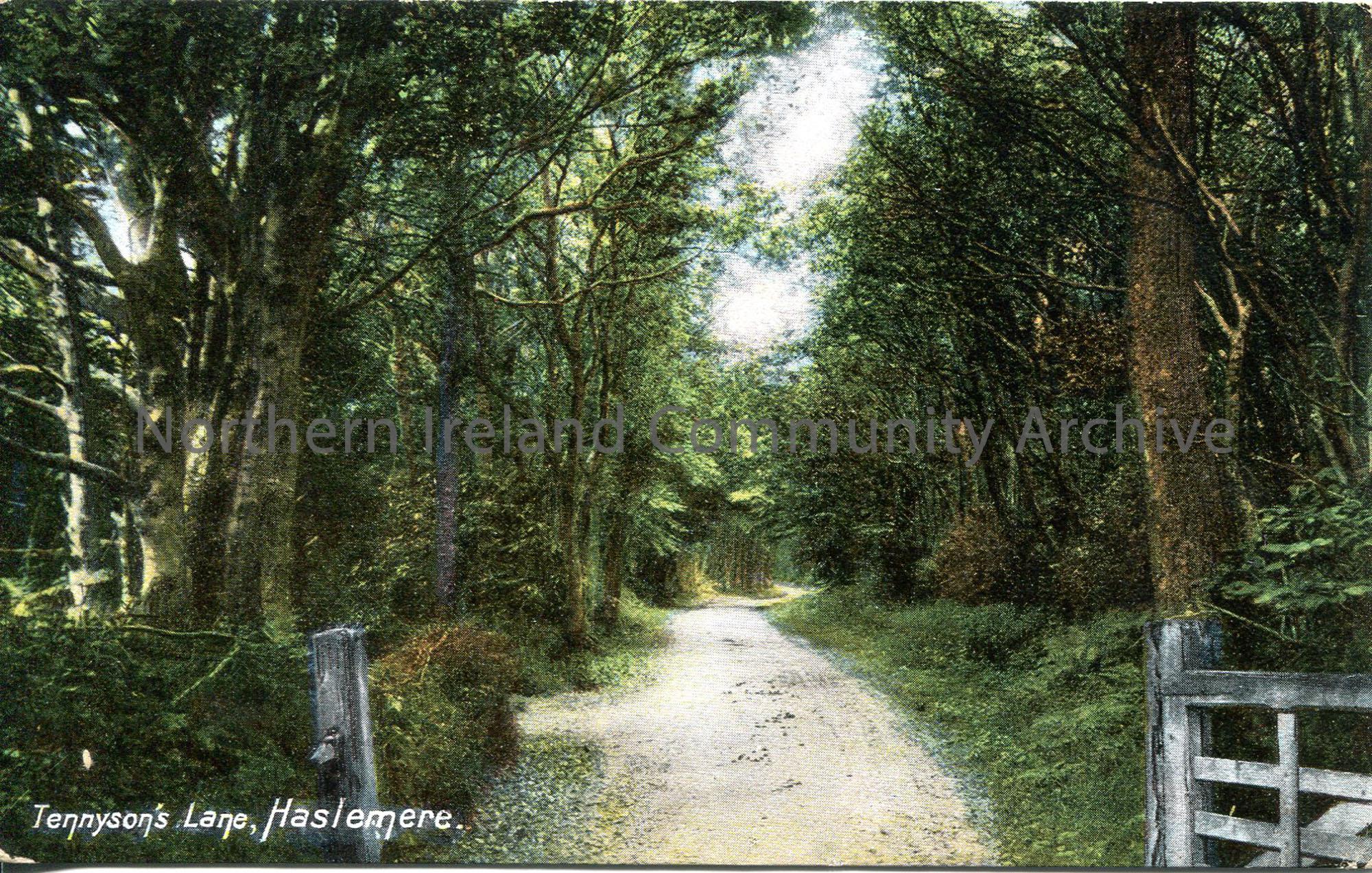 Colour postcard of Tennyson's Lane, Haslemere featuring a painted woodland scene. Addressed to Miss M[aimie] Liken, Dunedin, Coleraine, Ireland. From Sam Henry in 1909. Green, half penny King Edward VII postage stamp pasted top right corner. Sam writes, 'In the heart of rural England. Delightful'.