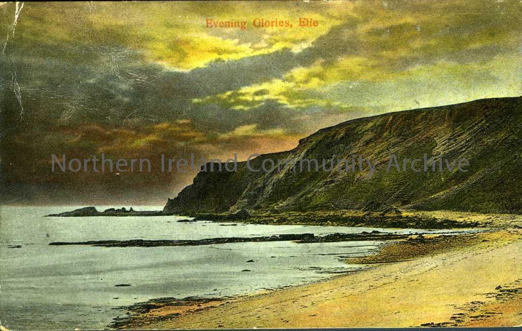 Colour postcard titled 'Evening Glories, Elie'. Seacape. Elie is in the East Neuk of Fife, Scotland. Addressed to Mr and Mrs J Sweeny, 4 The Diamond, Coleraine from Ken and Lottie.