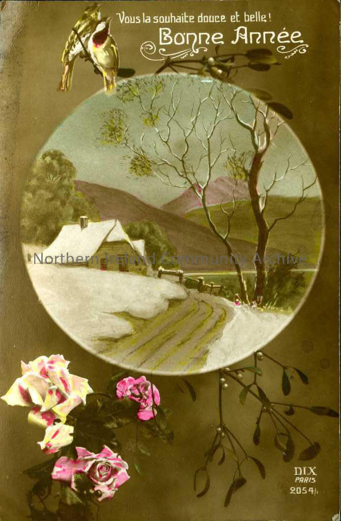 Colour postcard titled ‘Vous la soulhaite douce et belle! Bonne Annee’. Dated 30.12.1918 on the reverse with a handwritten message in French signed Al…