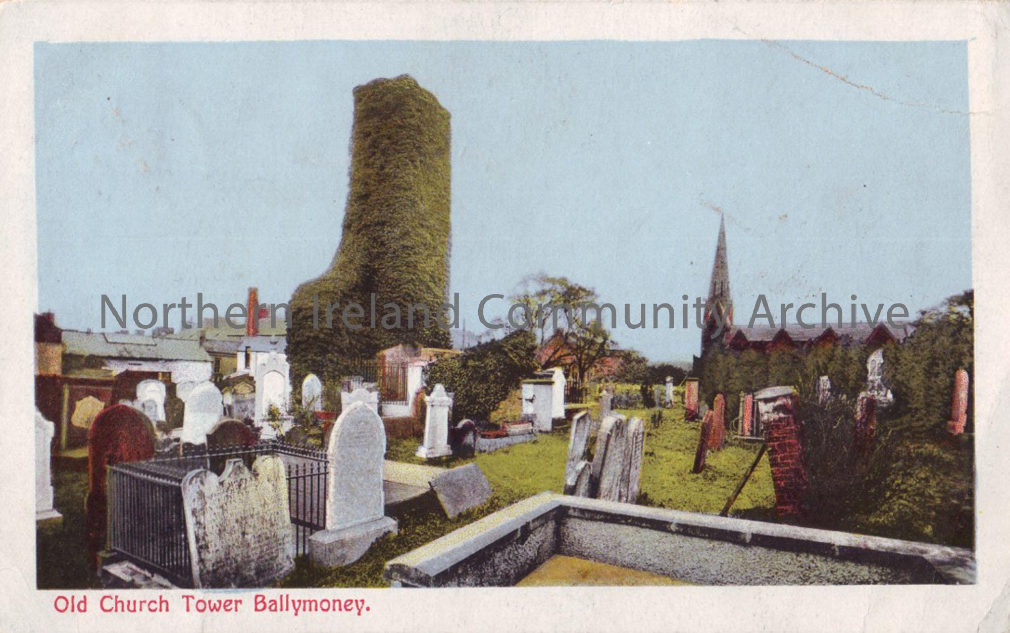 Coloured photograph of the Old church Tower, with graveyard in the foreground
