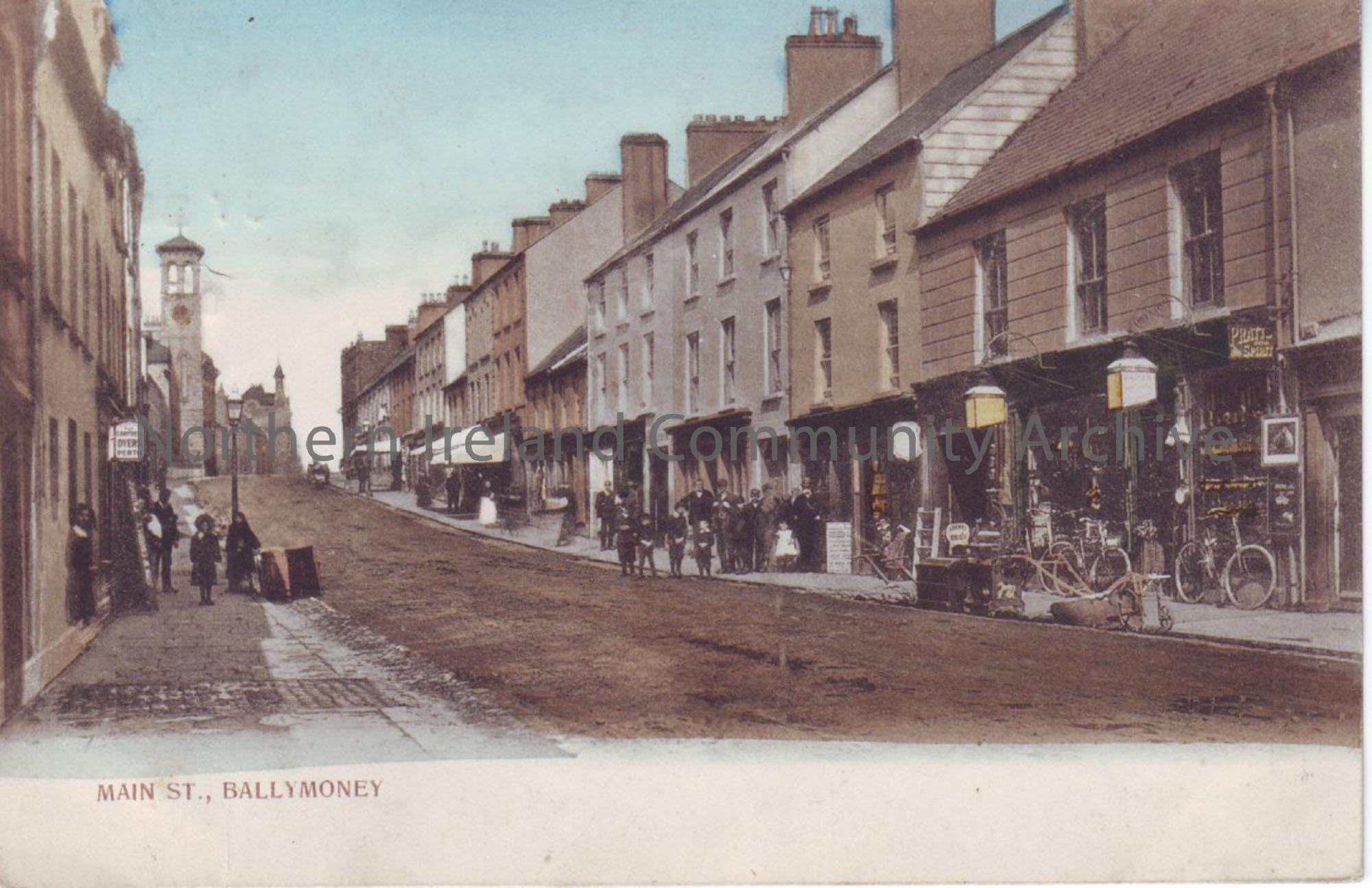 Coloured postcard of Main Street, Ballymoney. Has a half penny stamp and is date marked July 26 1905