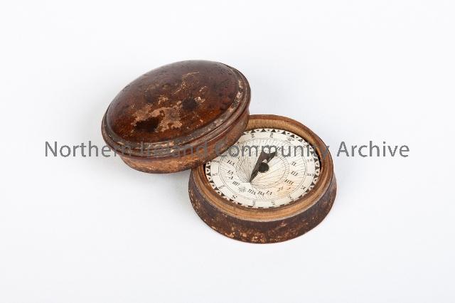 Small compass in a round wooden case. Courtesy of Coleraine Museum.