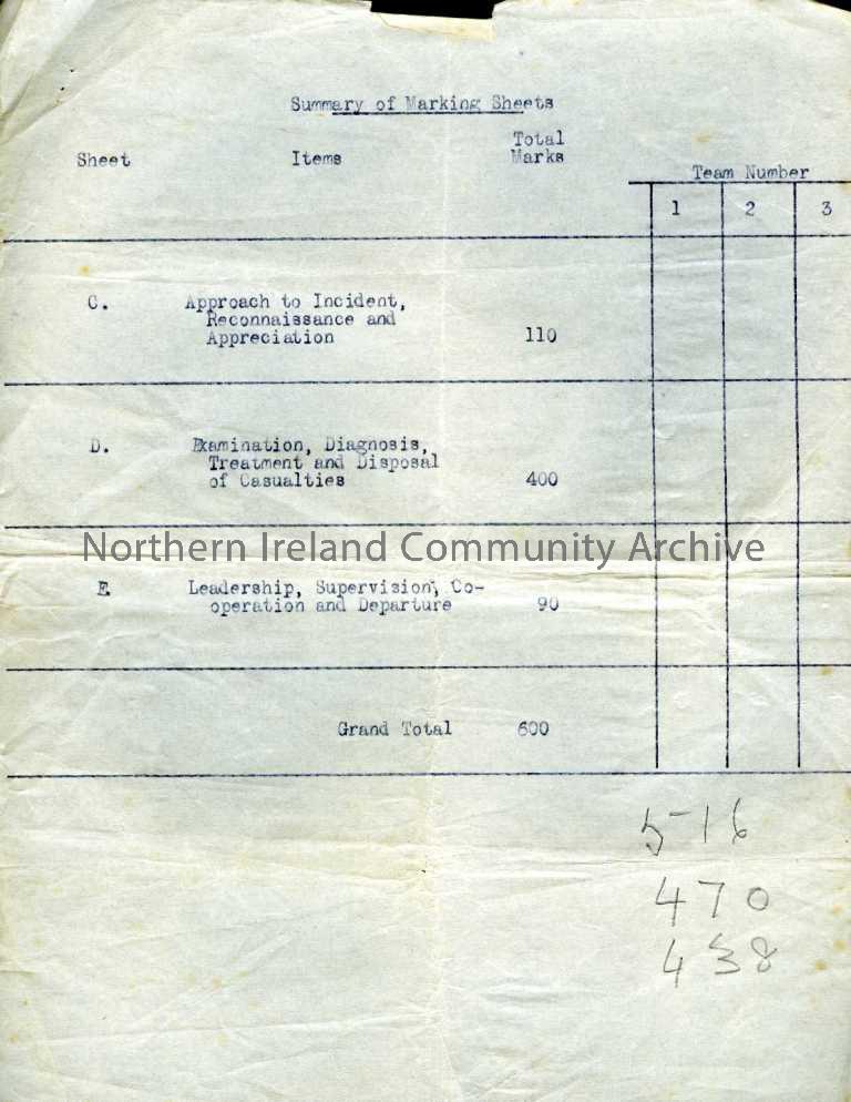 Competition Form for First Aid Civil Defence Exercise, titled ‘Summary of Marking Sheets’. 516, 470 and 438 handwritten in pencil beneath table.