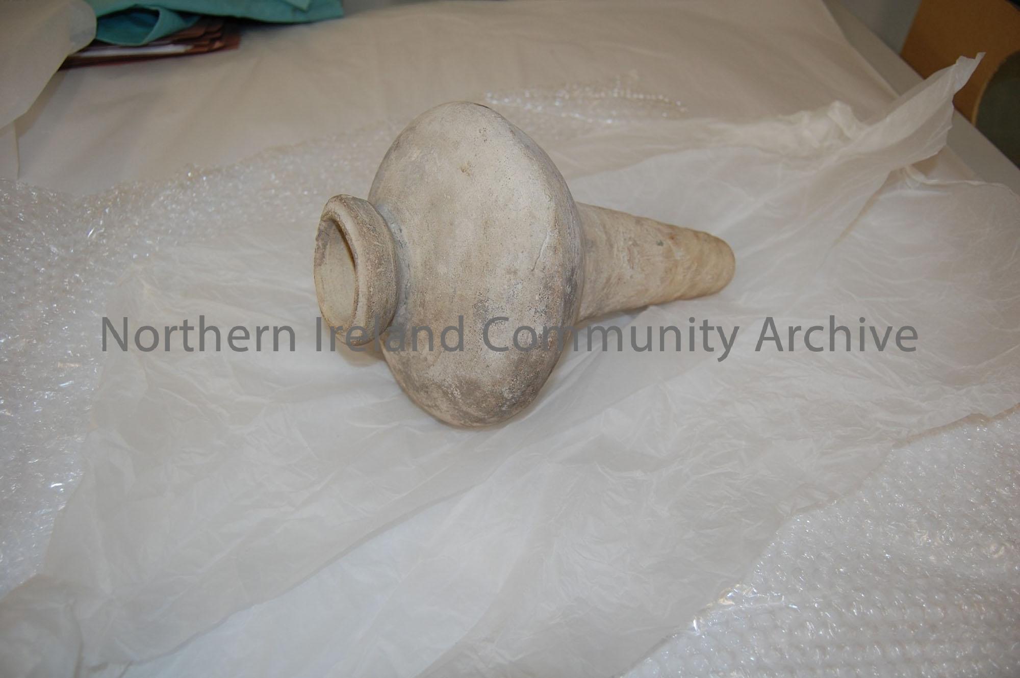 Cone shaped vessel, with a wide upper, and narrow lower; rounded base, would probably have been hung, or rested on a stand; Mediterranean (?) appearance