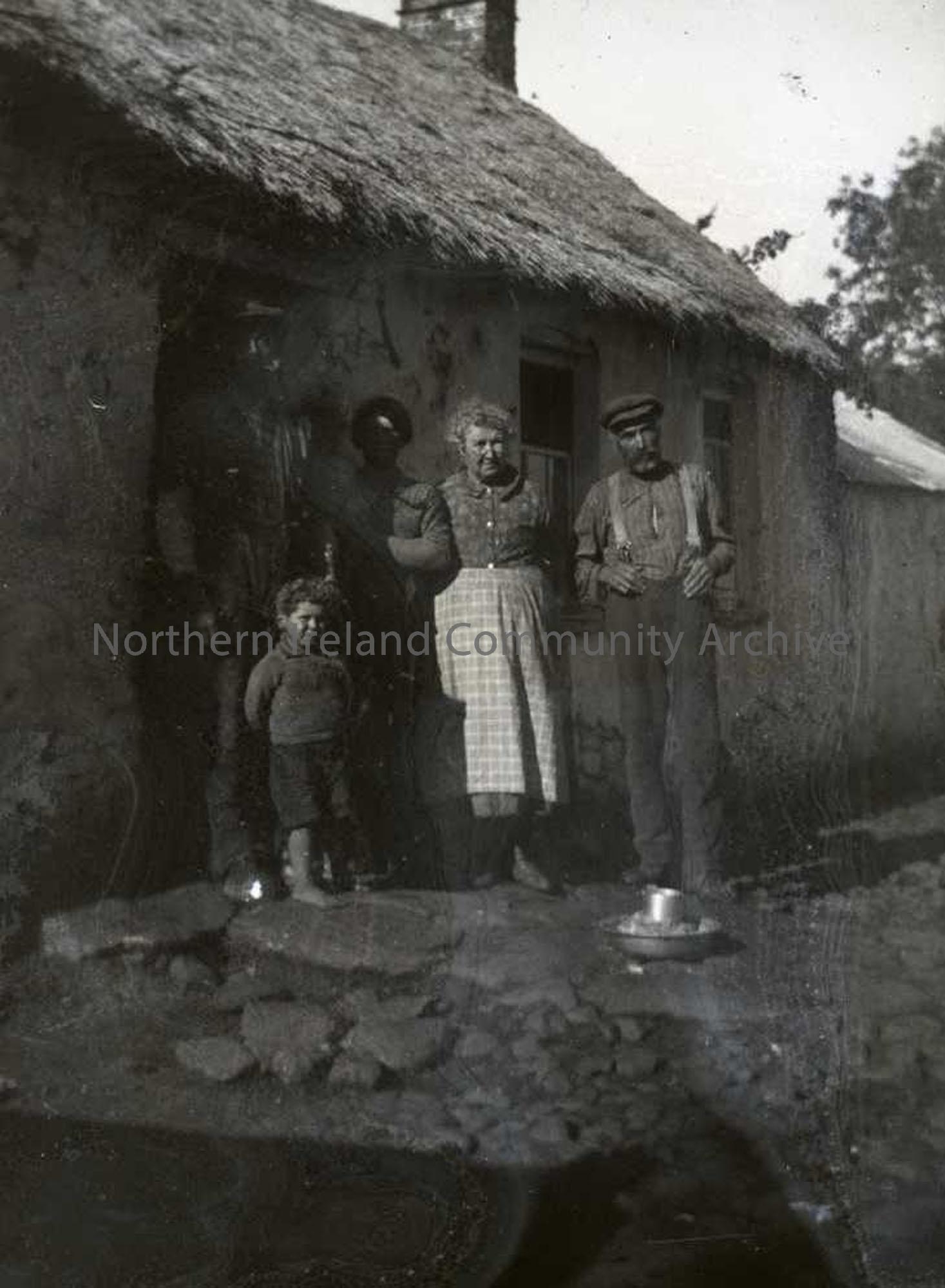 4 adults and child outside whitewashed thatched cottage. No 55 in Nature Slides inventory