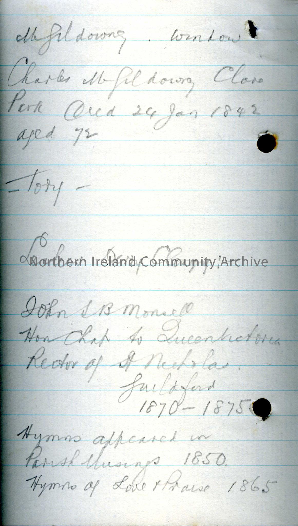 Continuation of notes on the the life and career of Rev. John Samuel Bewley Monsell, B.A., including notes taken from “Leslie’s Derry Clergy”. He is d… – Scan829
