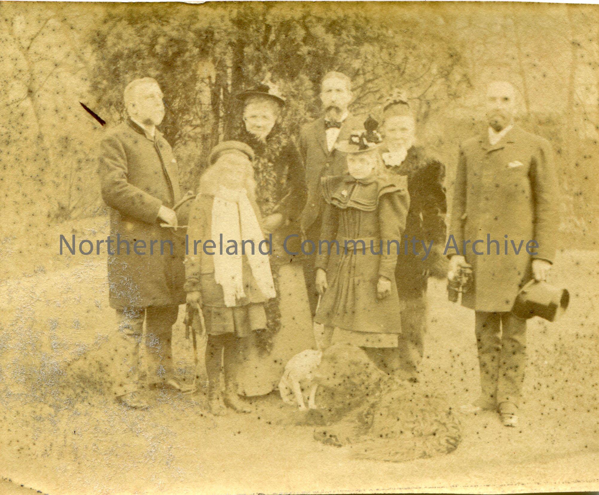 Copy of a black and white photograph of a family of four adults and two children with two dogs. No 171, 17th March, 1894 handwritten on reverse.