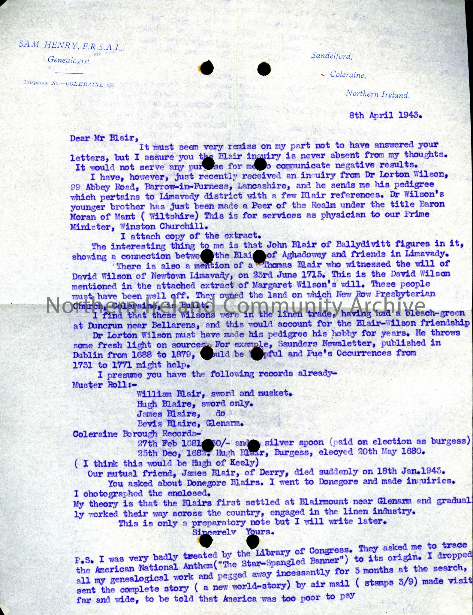 Copy of a letter to Mr. Blair regarding the pedigrees of the Blair and Wilson families who were involved in the linen trade. The enquiry about these families had come from a Dr. Lorton Wilson.