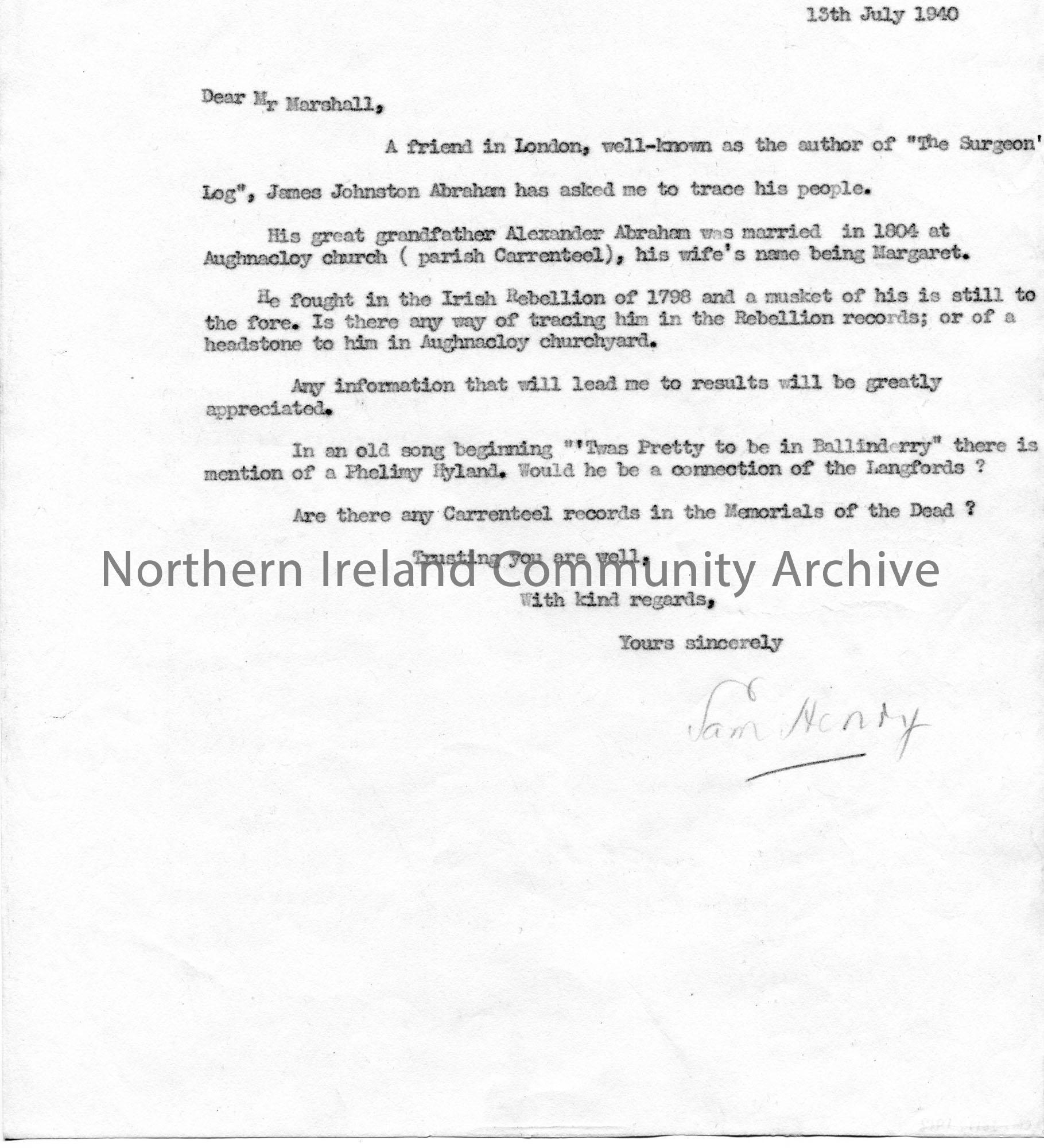 Copy of a letter to Mr Marshall. Requests help for research into the family of James Johnston Abraham. Asks if there is a connection between Phelimy Hyland and Longfords and if there are Carrenteel records in the Memorials of the Dead.