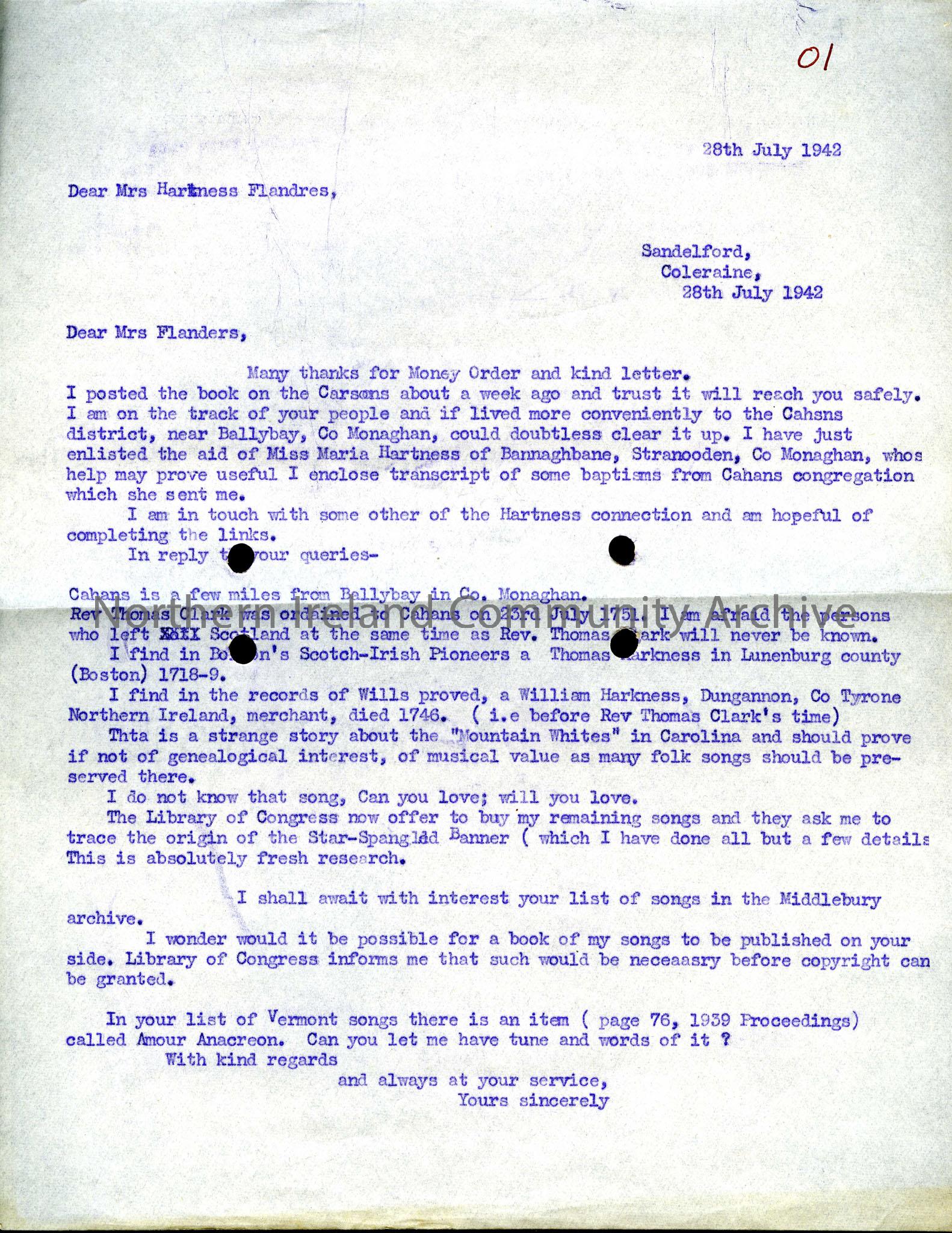 Copy of a letter to Mrs Hartness Flanders regarding Harkness baptism records in Cahans Church in Co. Monaghan and Rev. Thomas Clark who was ordained there on 23.7.1751. There is also mention of research on the Star-Spangled Banner and of Vermont songs.