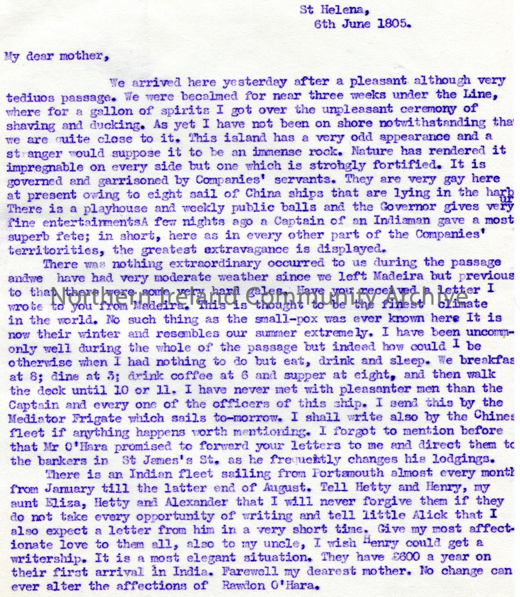 Copy of a letter transcribed by Sam Henry. To 'My dear mother'. Writes of their passage on a ship to St Helena.