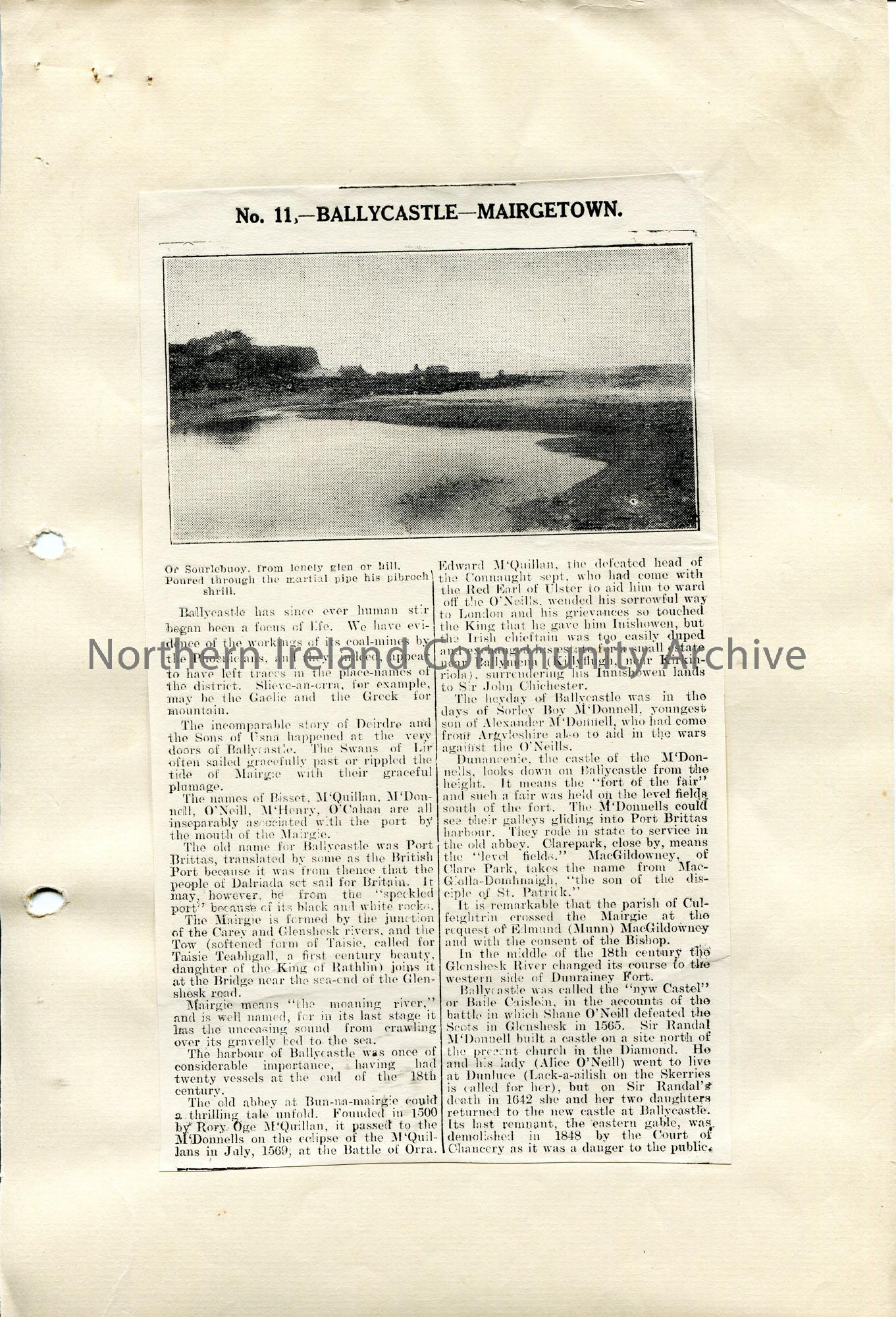 Copy of a newspaper article pasted to blank page. Article titled, ‘No. 11 – Ballycastle – Mairgetown’. Re the history of Ballycastle and the origins o…