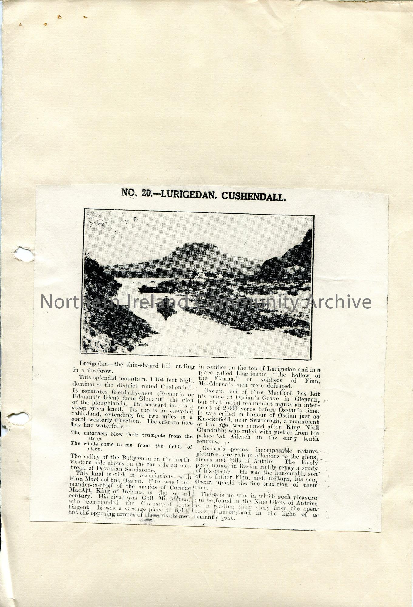 Copy of a newspaper article pasted to blank page. Article titled, 'No. 20 - Lurigedan, Cushendall'. Re description of the area and associations with Finn MacCool and his son Ossian.