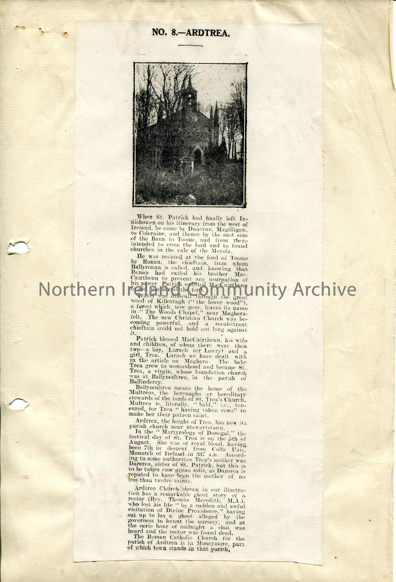 Copy of a newspaper article pasted to blank page. Article titled, 'No. 8 - Ardtrea'. Re St. Patrick's assistance from MacCairthenn to cross the ford at Toome and in return St. Patrick blessed MacCairthenn, his wife and children. Refers to a ghost story of the death of Rev. Thomas Meredith who was shot in Ardtrea Church.