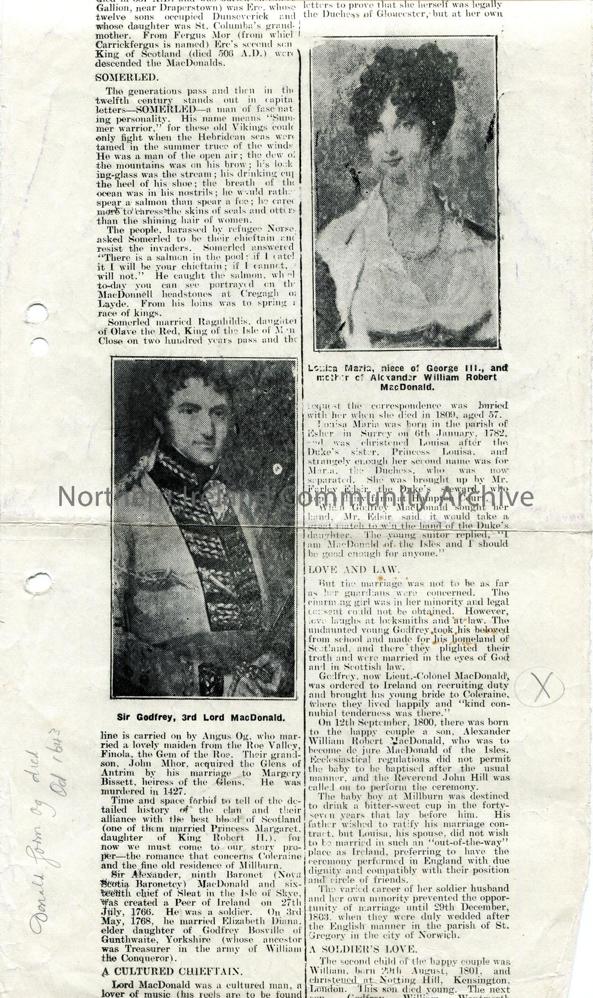 Copy of a newspaper cutting of an article titled, 'MacDonald Of The Isles. A Romance Of Coleraine. An Old-World Tale of Love and Law'. Re marriage of Louisa Maria and Godfrey MacDonald who resided at Millburn House, Coleraine where their son, Alexander William Robert MacDonald, was born. Features a photographic image of Millburn House, Coleraine.