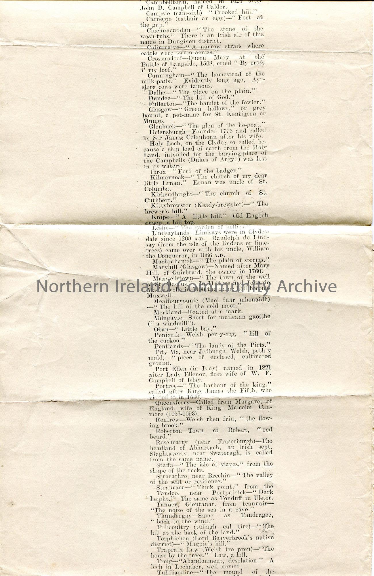 Copy of a newspaper cutting of an article titled, 'Scottish Place-Names. Interesting Volume of Topography. Beautiful Heritage in Celtic Names'. Re review and extracts from a book 'Place-Names of Scotland' by James B. Johnston. Gives a long list of names and their meanings.