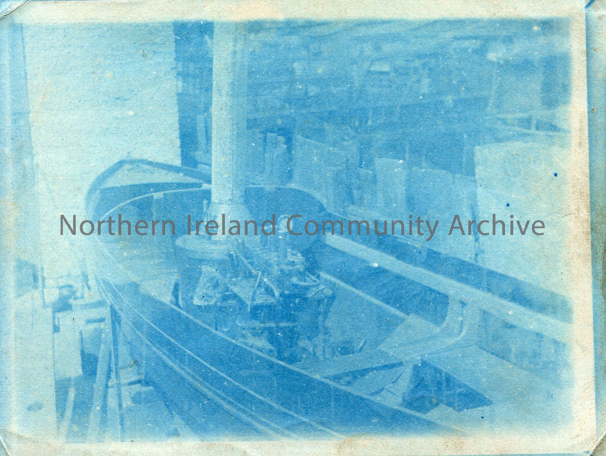 Copy of a photograph of a boat on dry land, possibly being made or repaired.