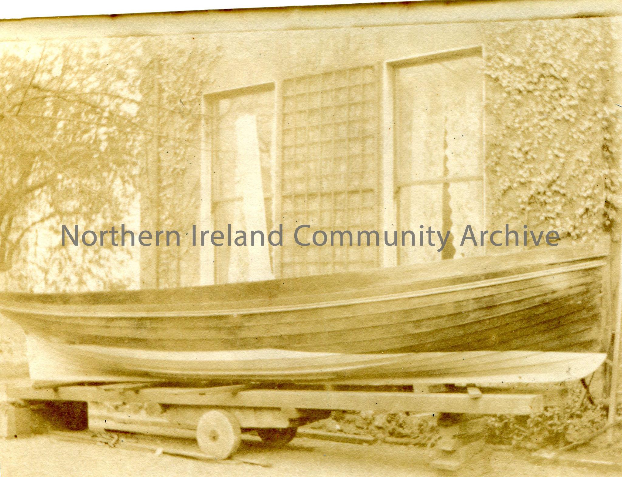 Copy of a photograph of a wooden boat on a trailer outside a building.