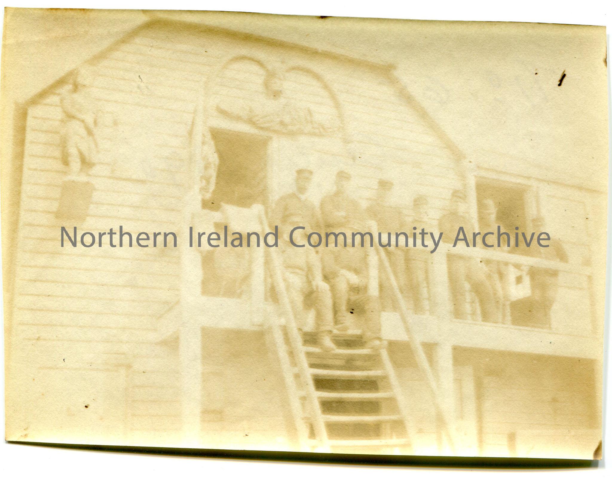 Copy of a photograph of nine men in uniform outside a building on a ledge. Two men are sitting on steps. No 65, August 1890 written on reverse.