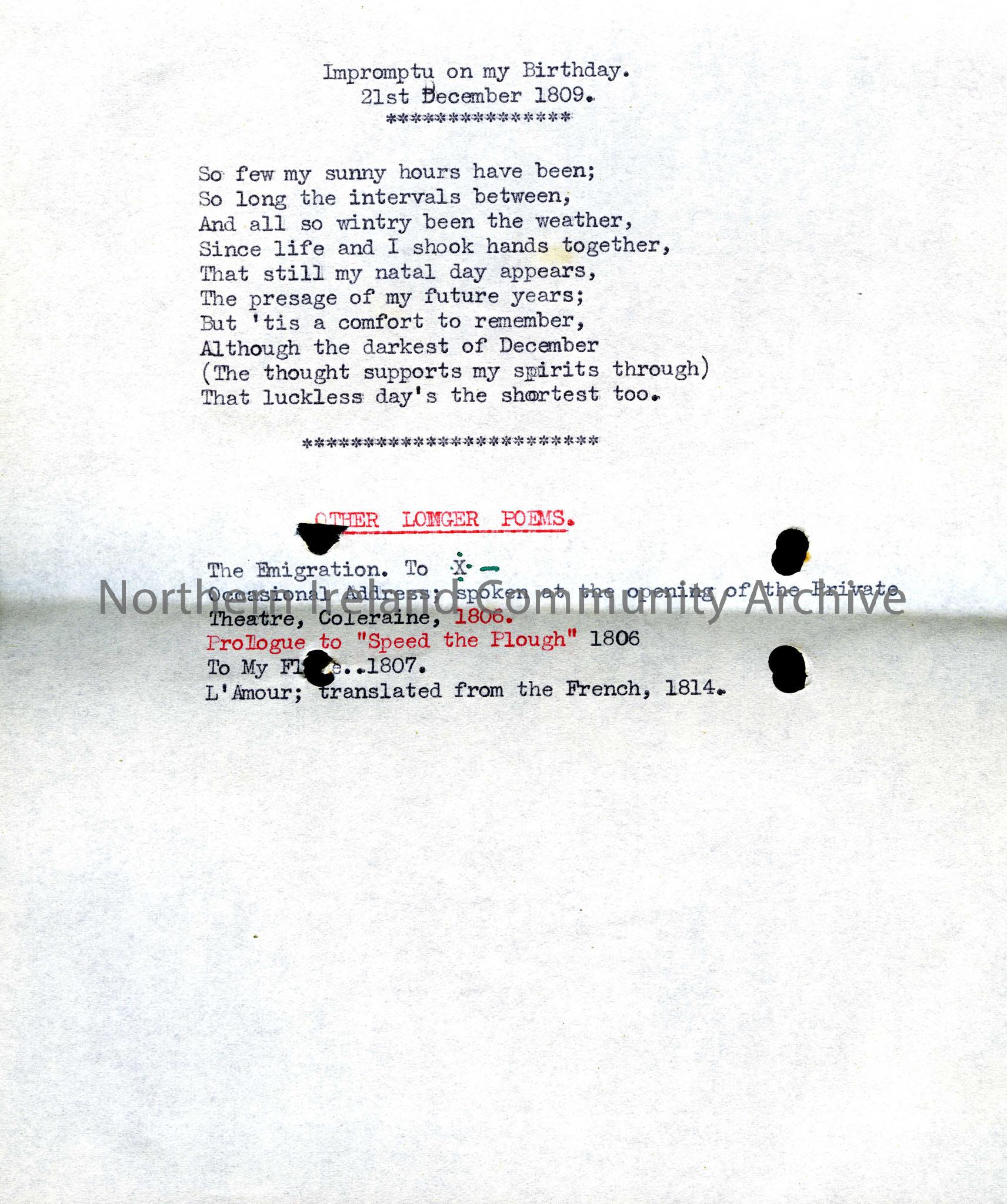 Copy of a poem entitled “Impromptu on my Birthday, 21st December 1809” and a list of longer poems.