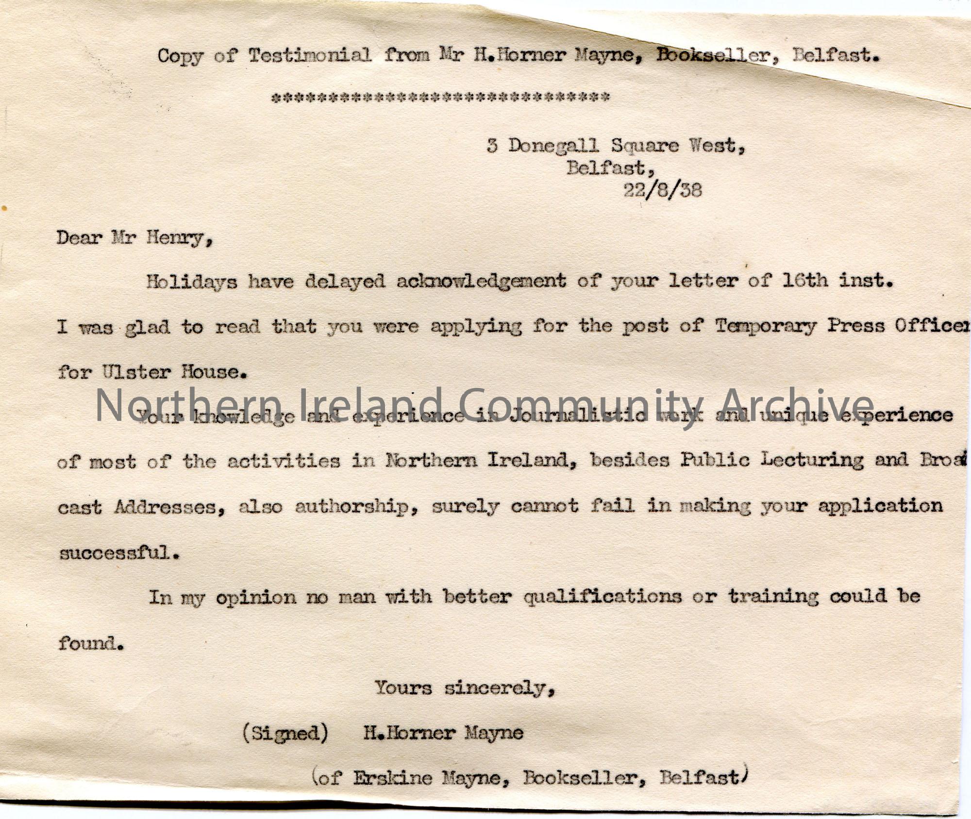 Copy of a transcription by Sam Henry of a typed letter to him. Re testimonial for Sam's application as Temporary Press Officer at New Ulster House. Speaks highly of his achievements to date.