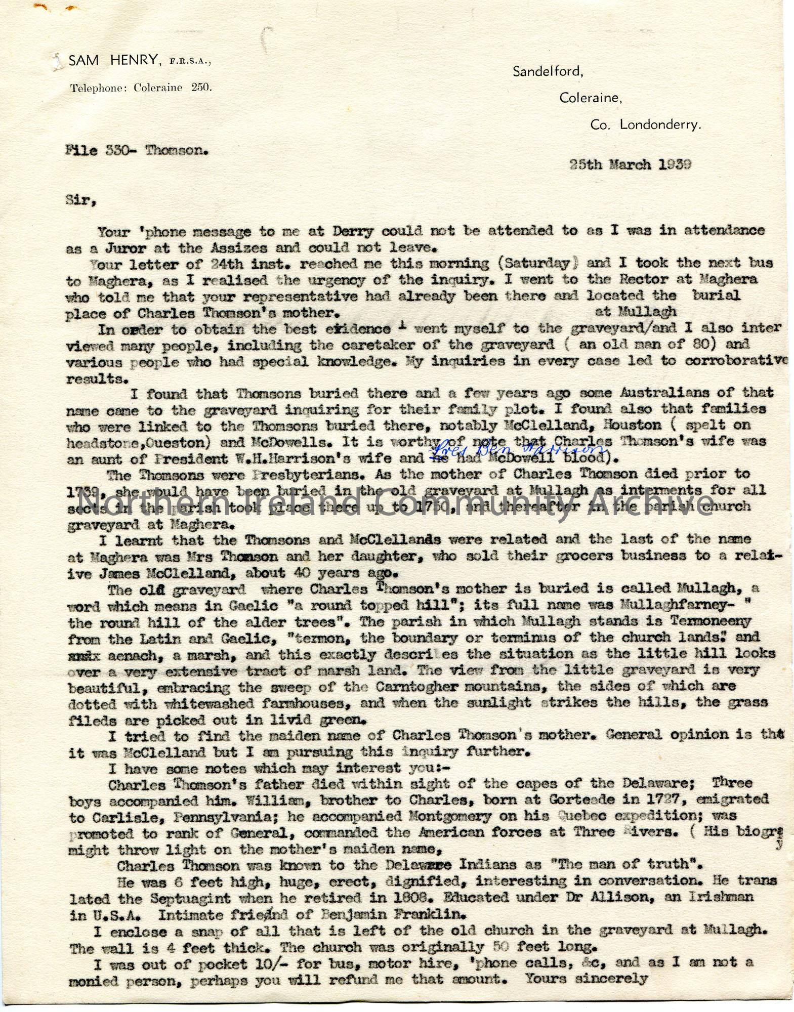 Copy of a typed letter on Sam Henry's personal headed paper. Replying to Ernest L Ives re the location of Charles Thomson's mother's grave. Sam has found it to be in a graveyard in Mullagh. Details other genealogical information he has come across re Charles Thomson. Sam requests fees of 10/-.