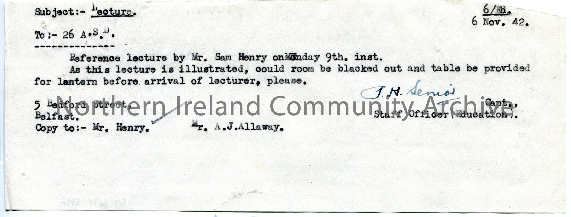 Copy of a typed letter on strip of paper to 26 A.S.D re Sam's lecture to troops. Copy of letter sent to Sam. Confirming lecture on 9th November 1942 and lantern arrangements. [Lecture most likely in Antrim - see CM:2017:3387].