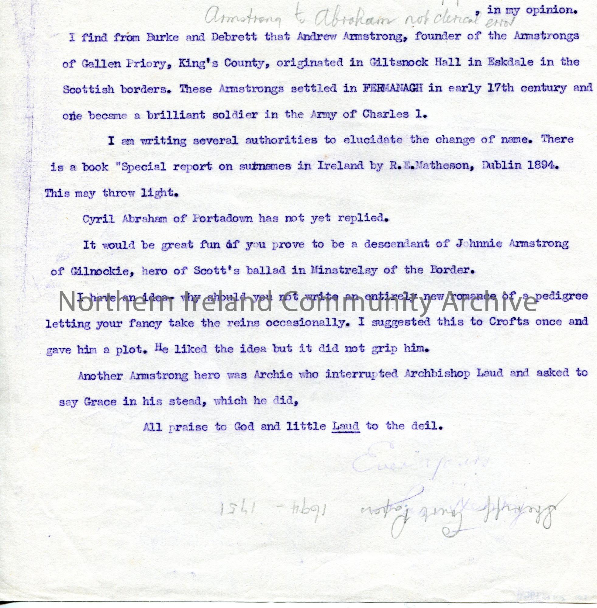 Copy of a typed letter. Recipient not named but most likely James Johnston Abraham whom Sam has been helping trace his family tree. Letter contains information re the Abraham family. 'Sheriff Court Papers 1694-1751' handwritten in pencil upside down at bottom of page.