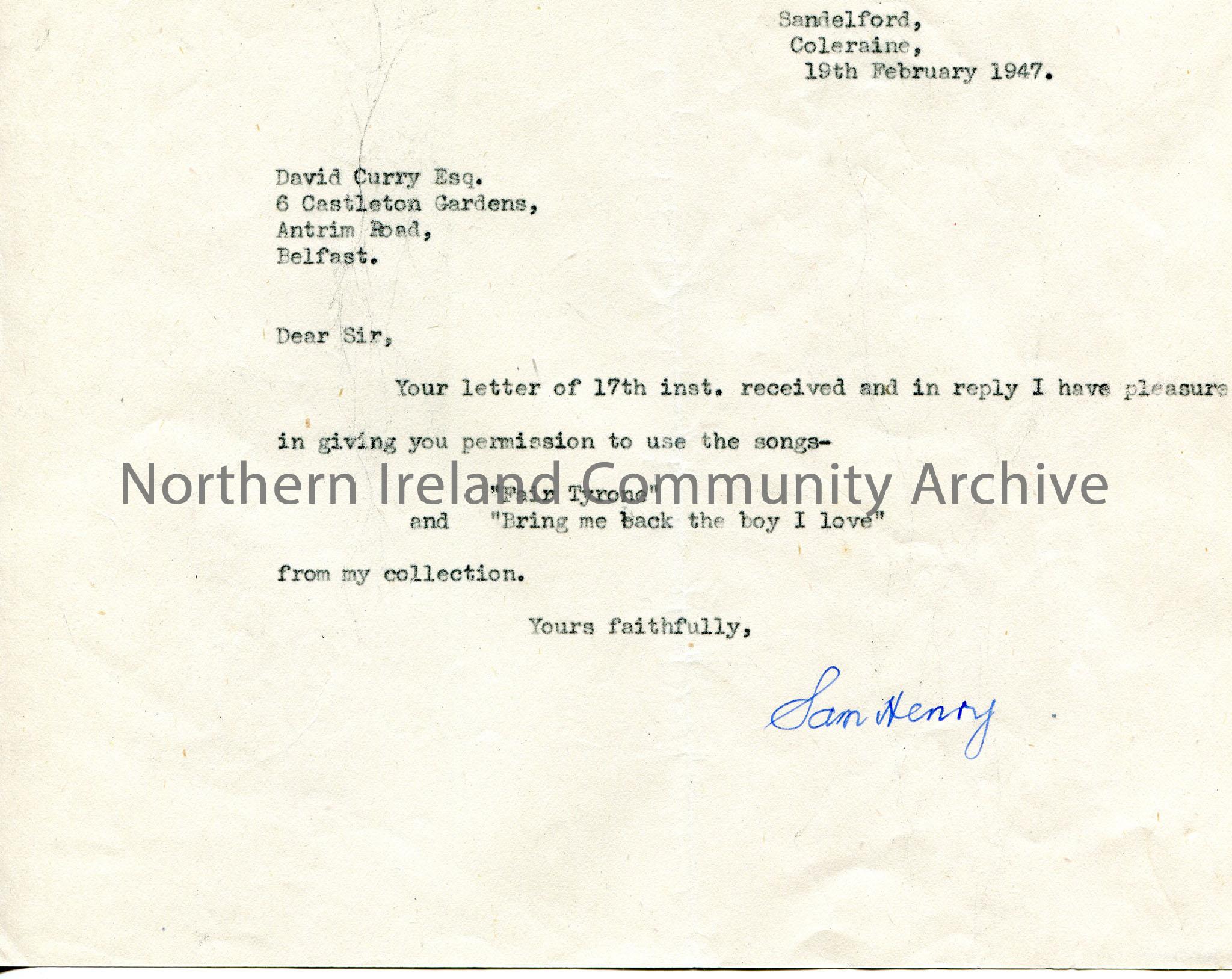 Copy of a typed letter to David Curry, 6 Castleton Gardens, Antrim Road, Belfast. Sam gives permission for use of songs 'Fair Tyrone' and 'Bring Me Back the Boy I Love'.