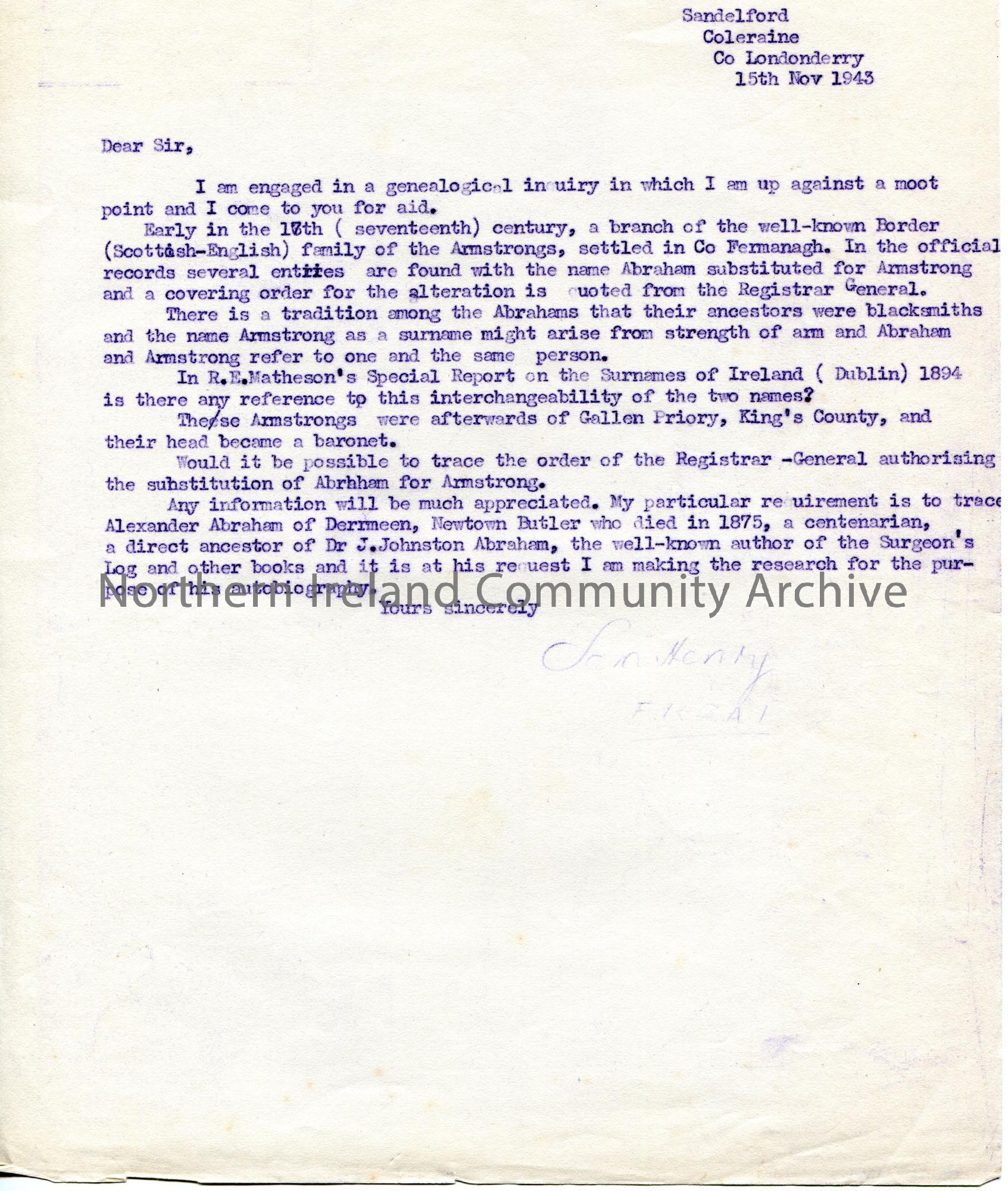 Copy of a typed letter to 'Dear Sir'. Re genealogical research for Dr James Johnston Abraham. Inquiring re the connection between the family name of Armstrong and Abraham.