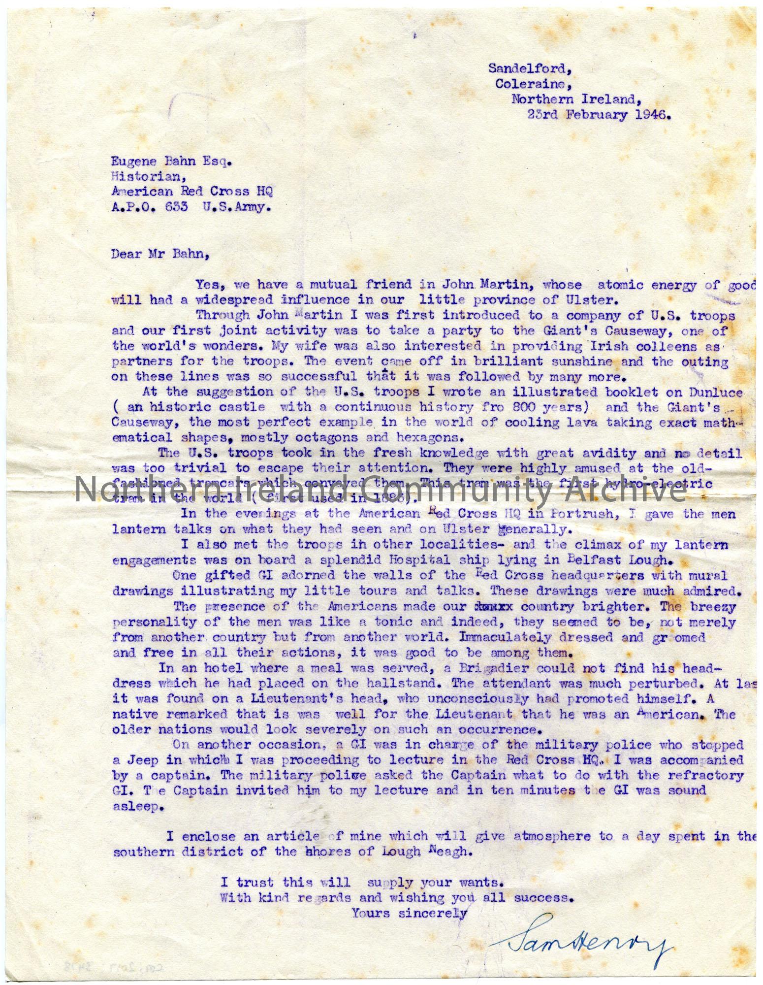 Copy of a typed letter to Eugene Bahn Esq. Writing re Sam's experience of the presence of US troops in Northern Ireland during World War II. Writes of a mutual friend, John Martin, who first introduced Sam to US troops in Northern Ireland. They took them to the Giant's Causeway as an activity. Notes that Sam's wife [Maimie] set up the troops with 'Irish Colleens'. Sam's creation of a booklet on Dunluce and the Giant's Causeway came about from the suggestions of the US troops. Sam gave lantern lectures to the troops in the American Red Cross HQ in Portrush and on board a hospital ship in Belfast Lough. Encloses article re a day spent at Lough Neagh.