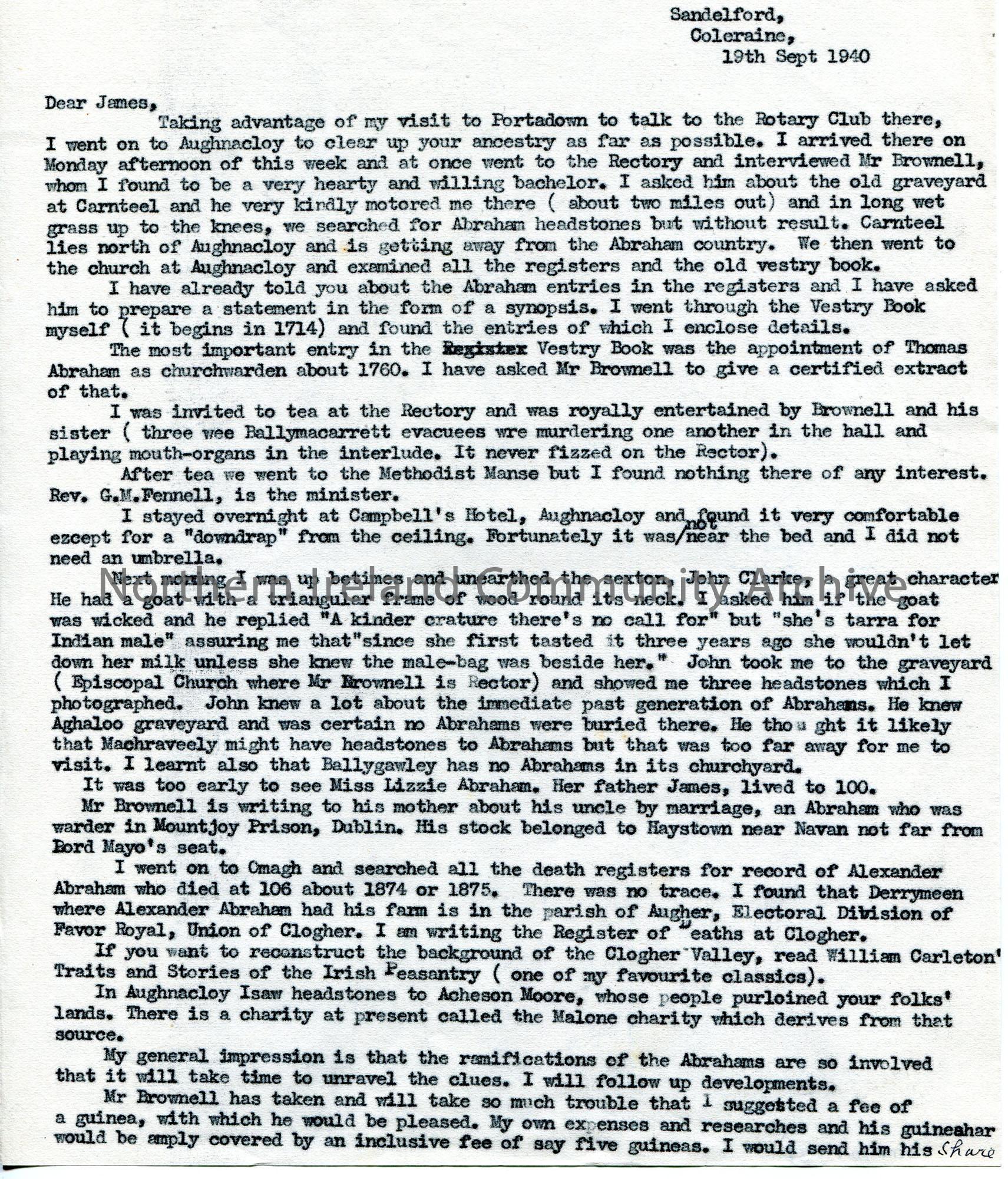 Copy of a typed letter to James [Johnston Abraham]. Informs James of his travels and research for the Abraham family. Visited Aughnacloy after his tal…