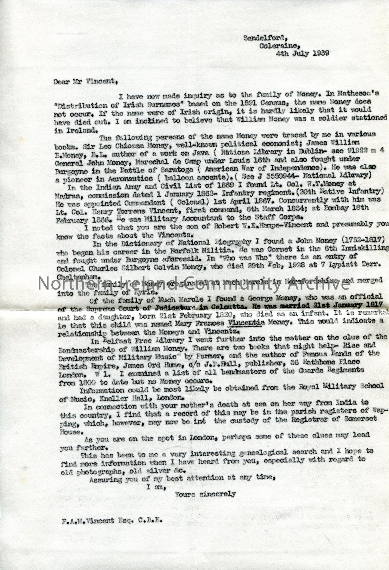 Copy of a typed letter to Mr F. A. M. Vincent, C.B.E. from Sam Henry. Re Sam's genealogy research for Mr Vincent. Sam has searched various sources which he notes for persons of the surname Money.