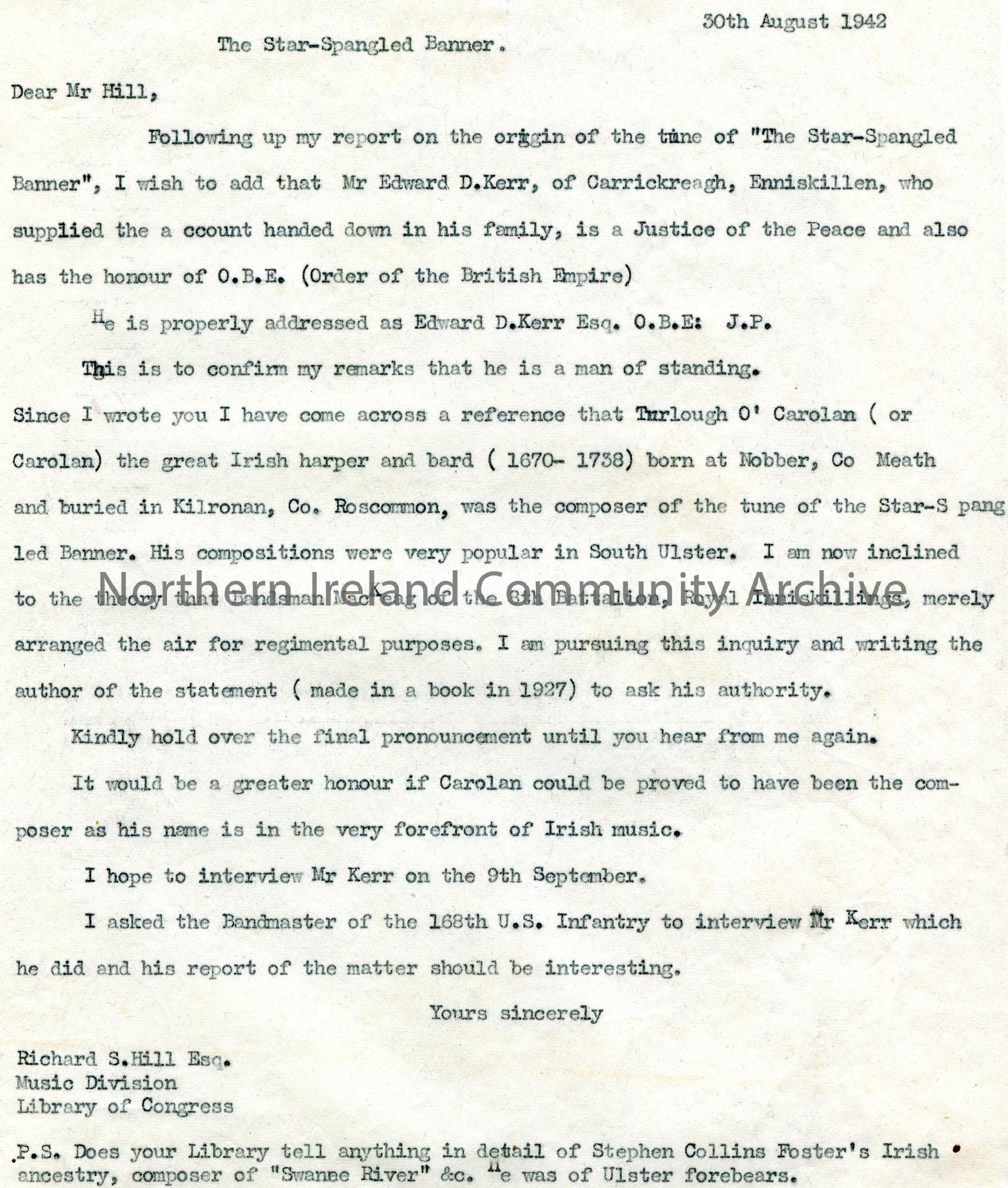 Copy of a typed letter to Mr Hill. Writing re the origin of the song 'The Star Spangled Banner'. Writes that Mr Edward Kerr of Carrickreagh, Enniskillen, is a Justice of the Peace and holds an O.B.E. Sam has researched that the Irish harper and bard, Turlough O'Carolan wa composer of 'The Star Spangled Banner'. Sam now believes that Bandsman MacKeag of 8th Battalion, Royal Inniskillings, merely arranged the air for regimental purposes. Hopes to interview Mr Kerr on 9th September. Bandmaster of 168th U.S Infantry to interview Mr Kerr. Asks for ancestry of Stephen Collins Foster, composer of 'Swanne River'.