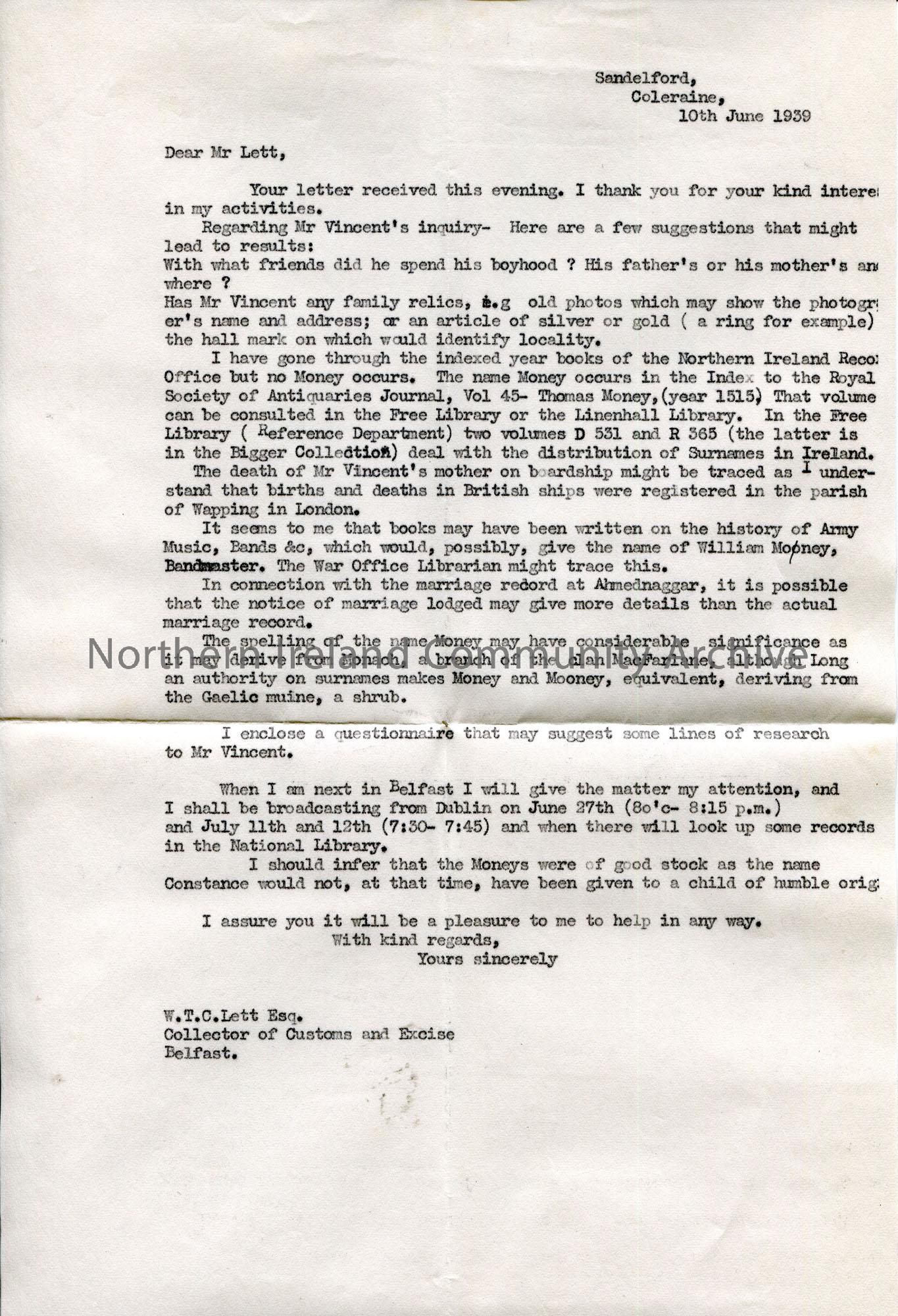 Copy of a typed letter to Mr Lett from Sam Henry. Writing re his family history research for Mr Vincent. He has made searches at the Northern Ireland Record Office and will visit the National Library in Dublin when broadcasting there over the next two months.