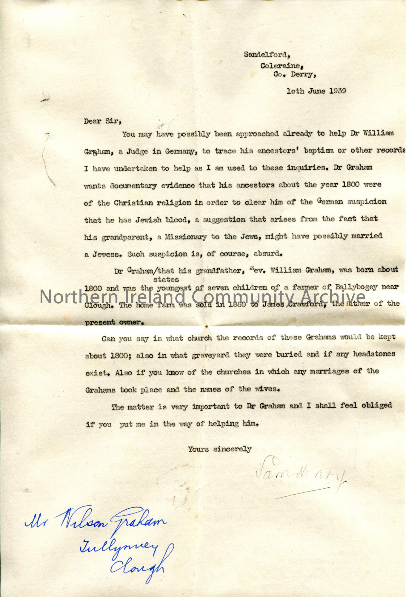 Copy of a typed letter to Mr Wilson Graham, Clough from Sam Henry. Re Sam's inquiries into the ancestors of William Graham, a Judge in Germany, in order to provide him with evidence to stop German suspicion that he is of Jewish blood.