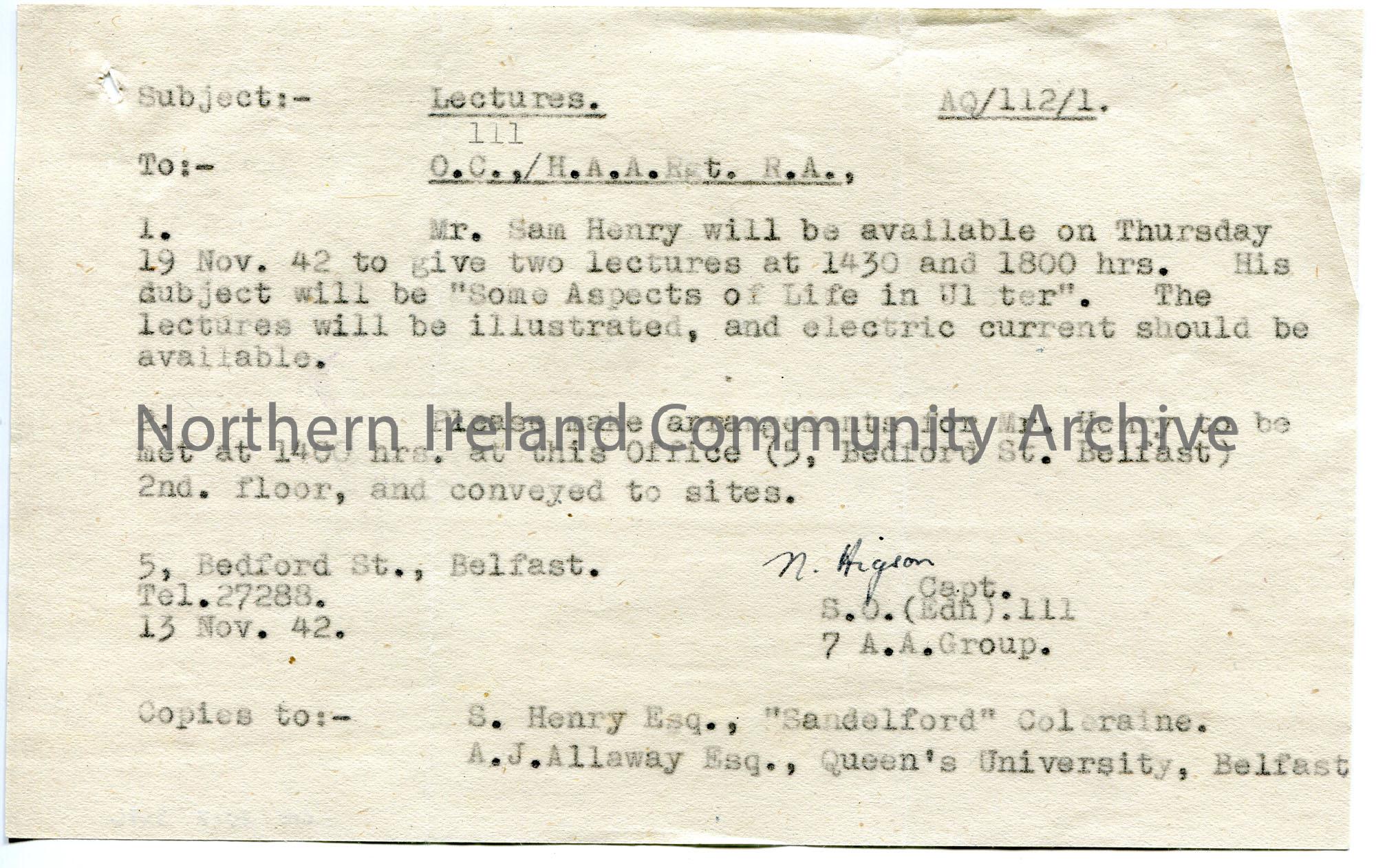 Copy of a typed letter to O.C.,/ H.A.A. Rgt., [Regiment]. R.A., re Sam's lecture to troops. Copy of letter sent to Sam. Sam to lecture on 19th November 1942 at 14:30 and 18:00 on 'Some Aspects of Life in Ulster'. Asking for travel arrangements to be made for Sam to get to the lecture.