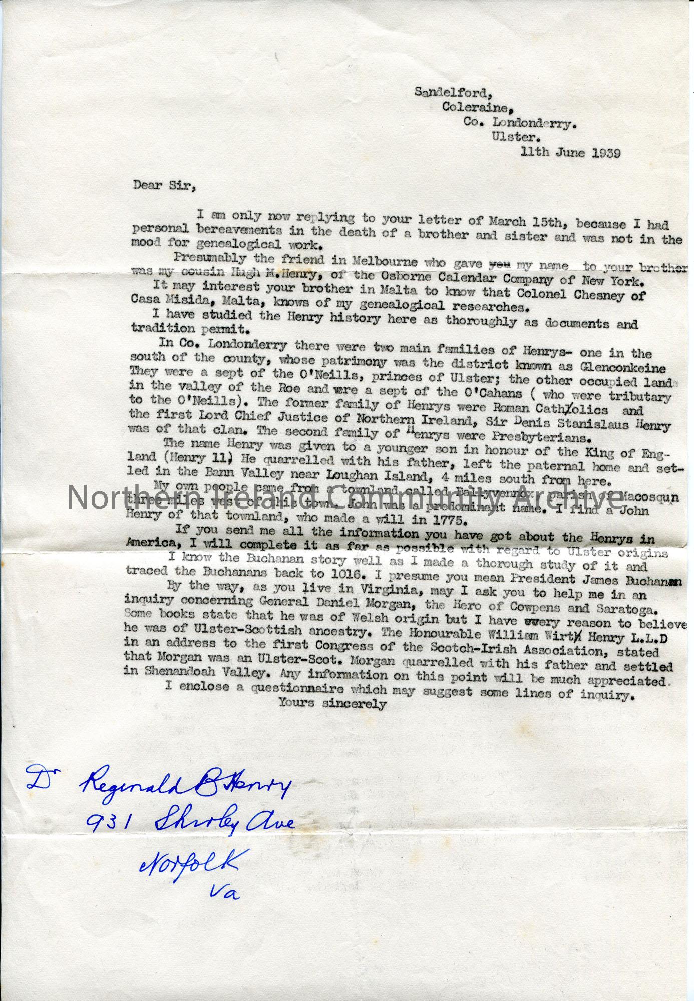 Copy of a typed letter to Reginald B Henry from Sam Henry. Re Henry and Buchanan genealogy. Apologises for late reply due to the deaths of his brother and sister. Thinks that his cousin, Hugh M. Henry, was the one who passed Sam's details to Reginald's brother. Gives an account of the two main Henry families in County Londonderry. Sam's side of the family came from Ballyvennox, Macosquin. Sam to work on the Ulster origin of the Henrys in America. He has completed a 'thorough study' of the Buchanan family. Asks Reginald Henry to help him with research re General Daniel Morgan.