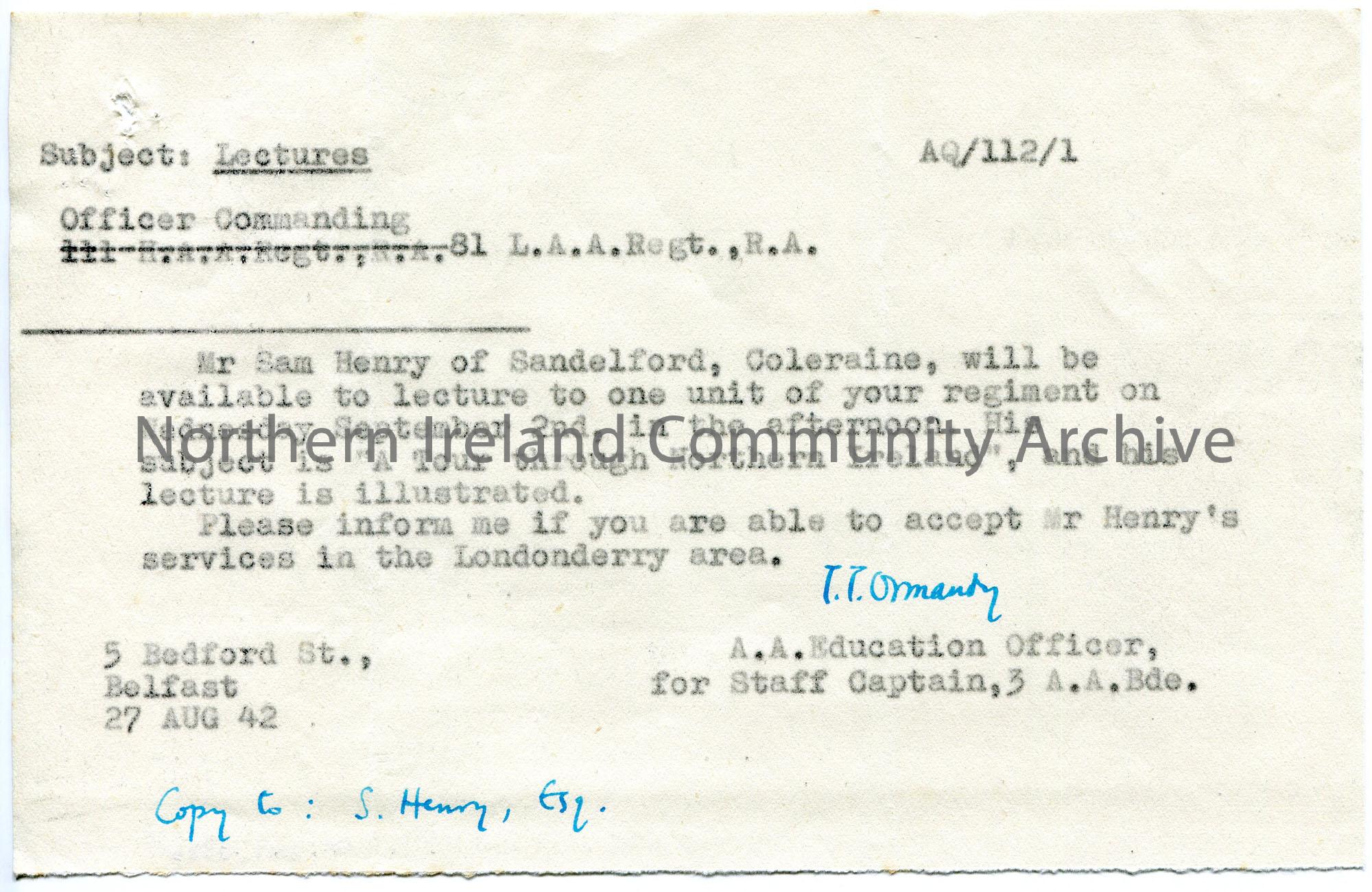 Copy of a typed letter to Sam Henry. Original letter to Officer Commanding 81 L.A.A. Regt., R.A. Re lectures. Confirming that Sam will be lecturing the Unit on 2nd September 1942. Recipient to accept.