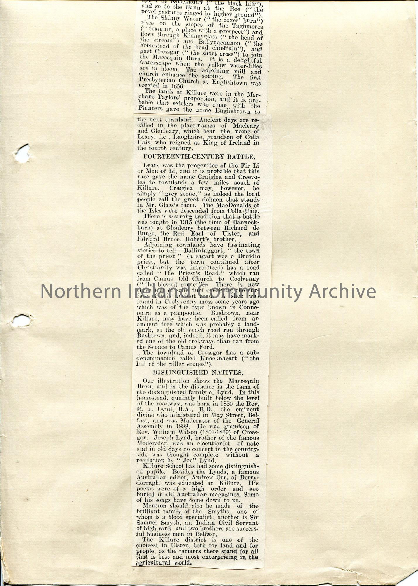 Copy of an article pasted to page titled, 'No. 29. - Killure, Coleraine'. Re the history of the Killure district (between Macosquin and Shinny Water rivers). Mentions Andrew Orr as native of the area (went to Killure School). Image from article is missing as it is referred to in the article showing the Macosquin Burn.