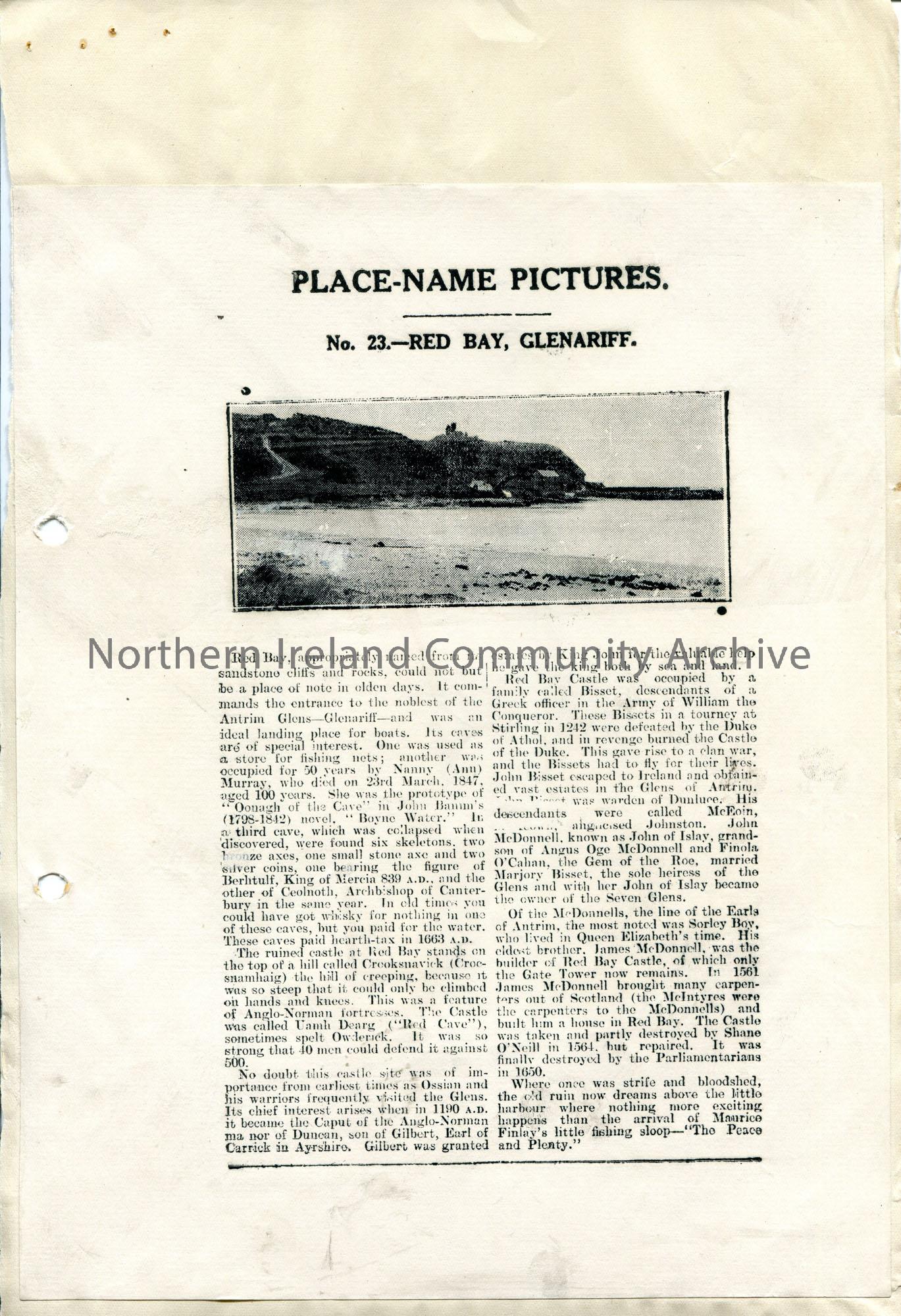 Copy of an article with photographic image titled, ‘Place-Name Pictures. No. 23. – Red Bay, Glenariff’. Re the history of the Bay.