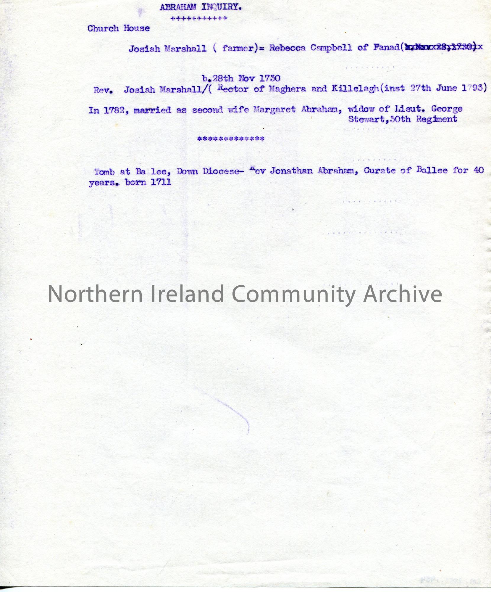 Copy of typed notes re Abraham Inquiry. Genealogical information re the Abraham family for James Johnston Abraham.